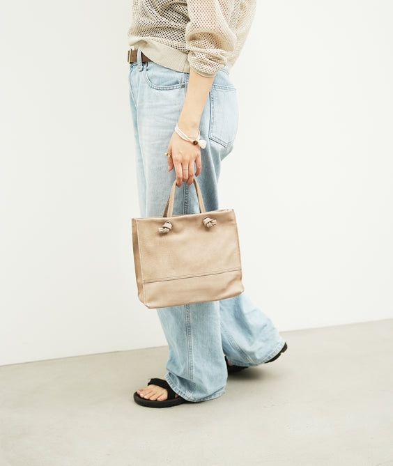 トワルは経年変化しにくい素材ではありますが、ほかのレザーと同様に、使っていくと汚れやシワが出てきます。私たちがじっさいに使っていくなかで、とりわけ変化が大きいと感じるのは、ハンドル部分でした。そこも、紙袋をイメージしていただくとわかりやすいかもしれません。
