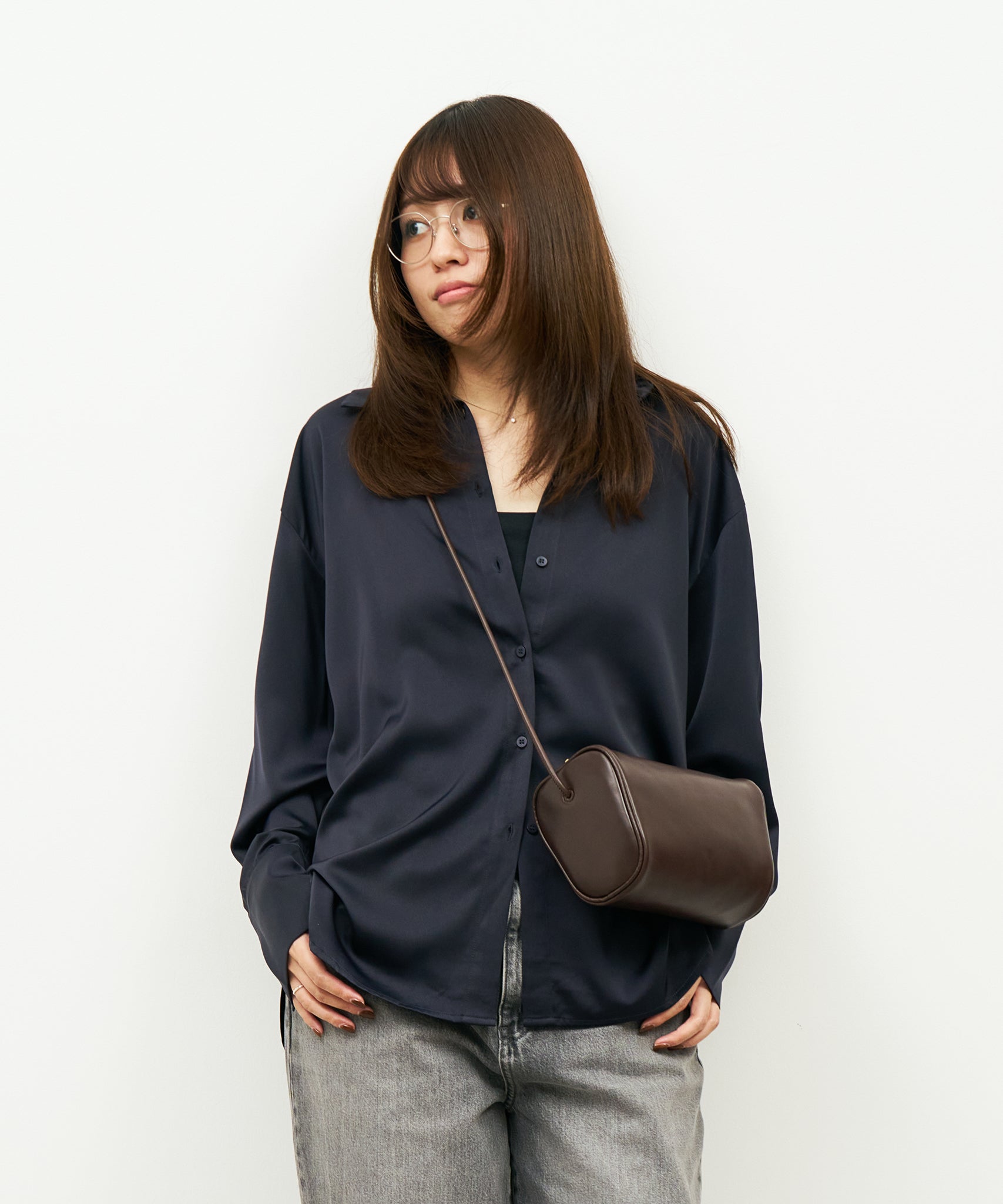 側面の丸みある逆三角形を起点にした、筒状のショルダーバッグ「フロートミニショルダー」。コンパクトですが、長財布も収まる横長のかたち。口元はファスナー開閉で、上に向かって広がっているので、広く開いて中身が見やすいのも特徴です。