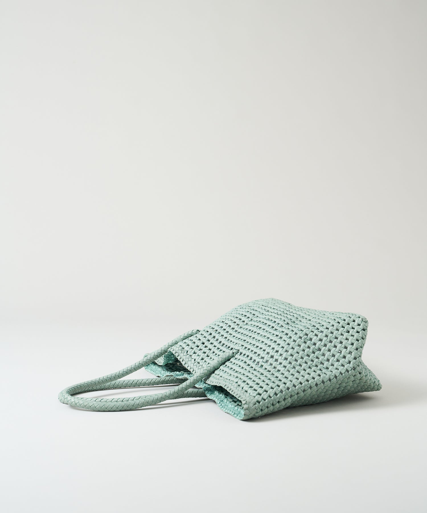 裁断した革を継ぎ合わせてできた長い紐を丁寧に編み込んであるため、同じ面積の製品を作るのに比べ、約5倍もの革を必要とします。名うての職人が集まるインドのアトリエで、細部まで抜かりなく、美しく編み込まれており、てまひまも惜しみなく詰まっています。そうして規則正しく編まれた革は丈夫でありながら、涼しげな透け感や軽快さが特長。