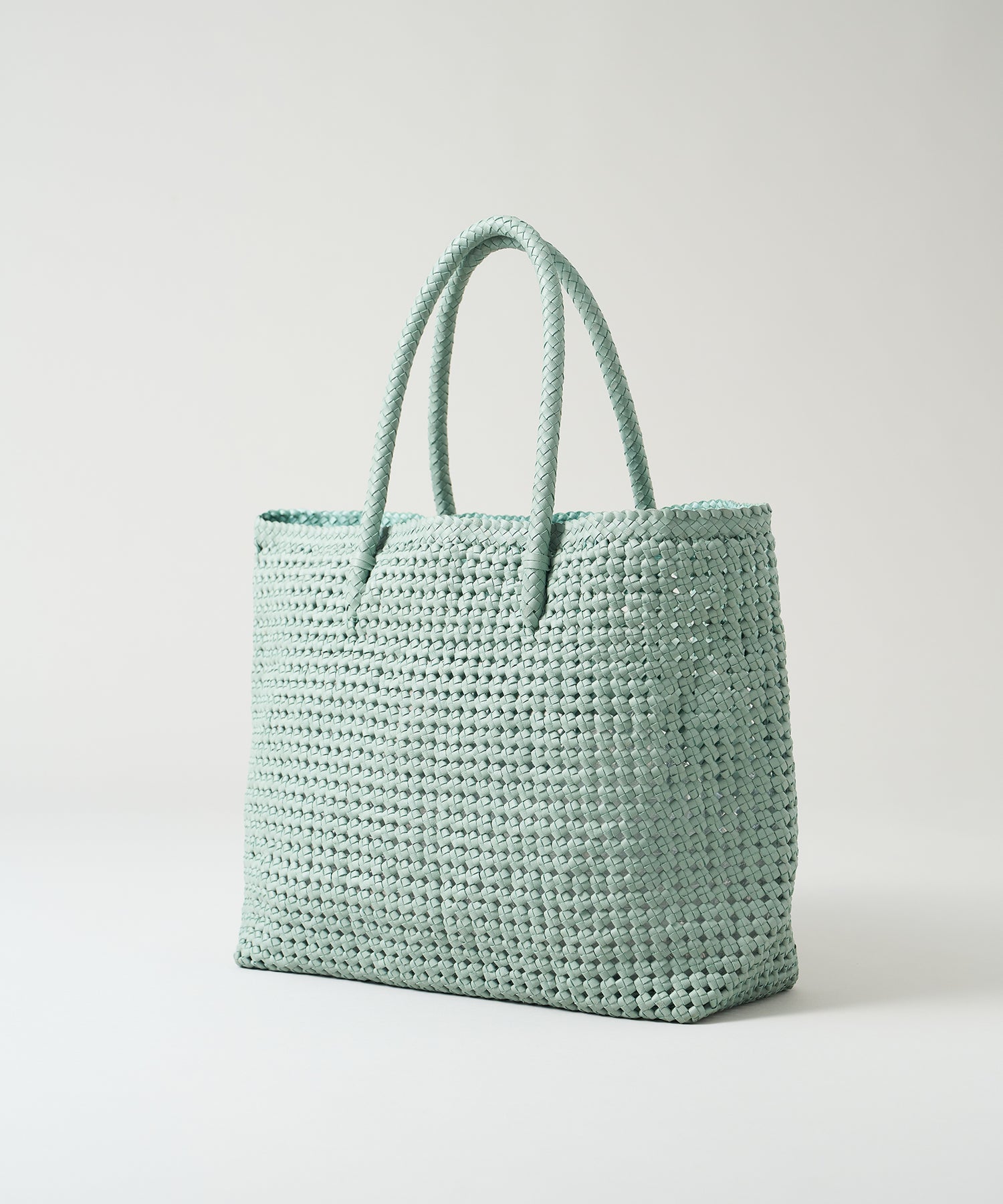 裁断した革を継ぎ合わせてできた長い紐を丁寧に編み込んであるため、同じ面積の製品を作るのに比べ、約5倍もの革を必要とします。名うての職人が集まるインドのアトリエで、細部まで抜かりなく、美しく編み込まれており、てまひまも惜しみなく詰まっています。そうして規則正しく編まれた革は丈夫でありながら、涼しげな透け感や軽快さが特長。