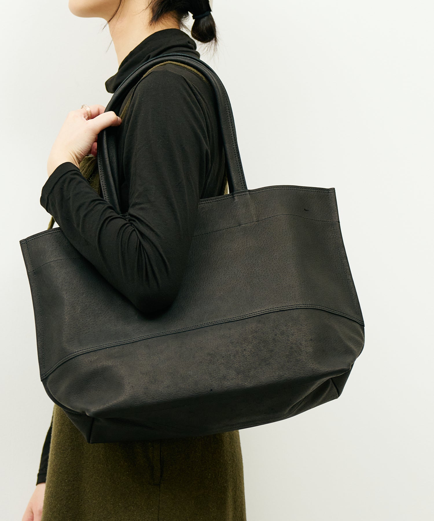 レザーでありながらも、布袋のような感覚。レザーバッグは重くてかたい、そんなイメージを覆す、ピッグスキン・ハリーだからこそうまれた日常に馴染むトートバッグです。