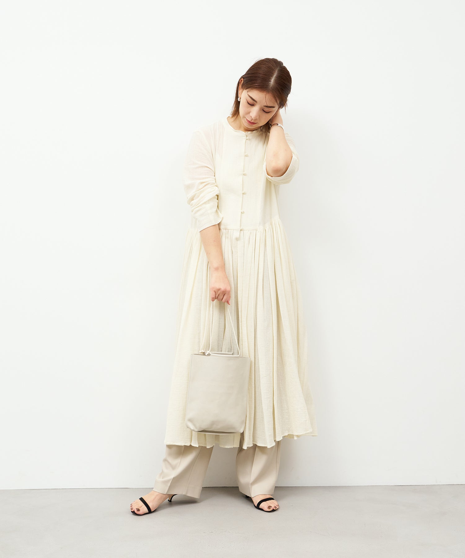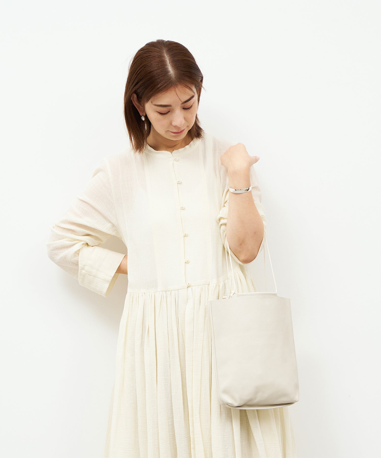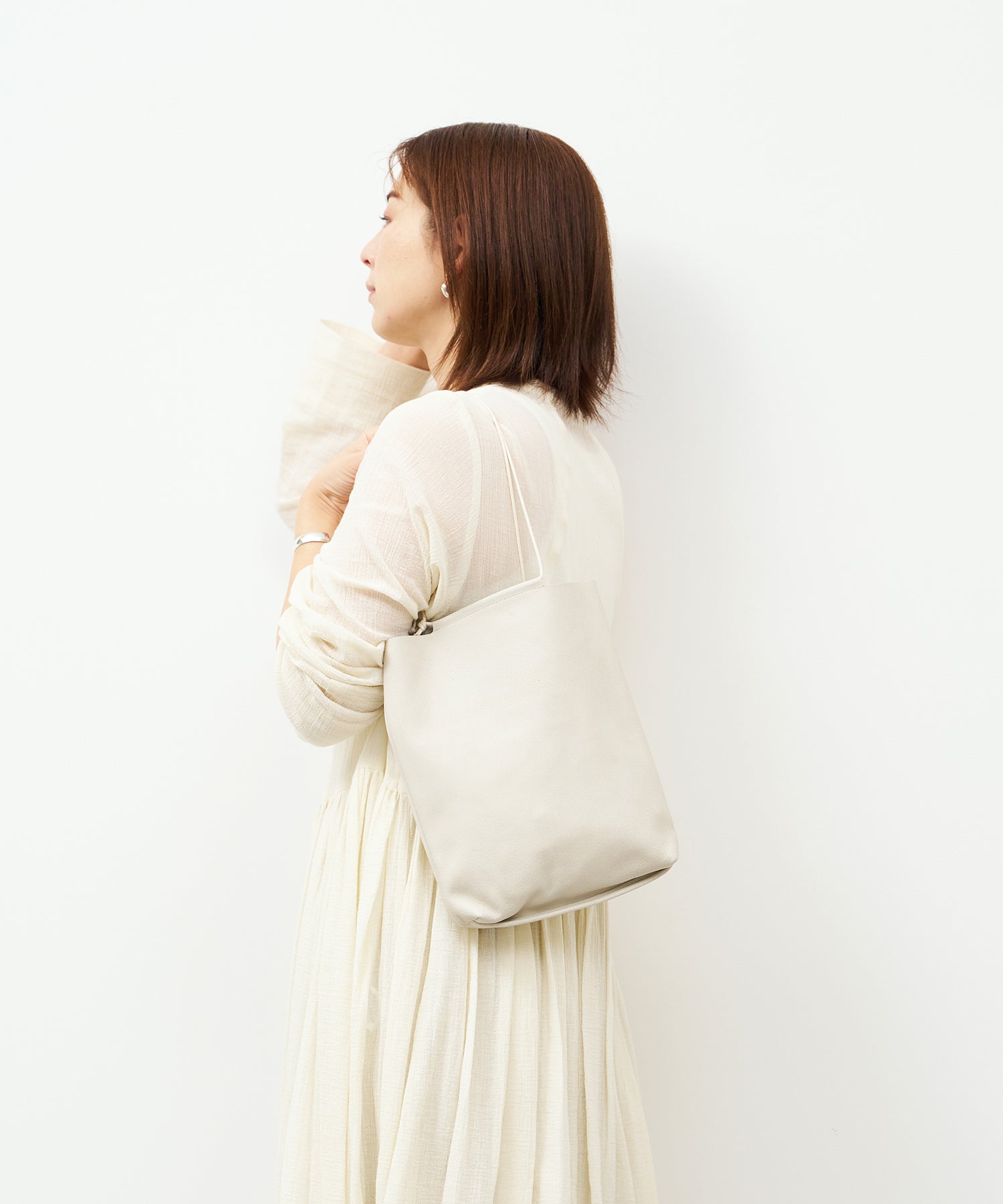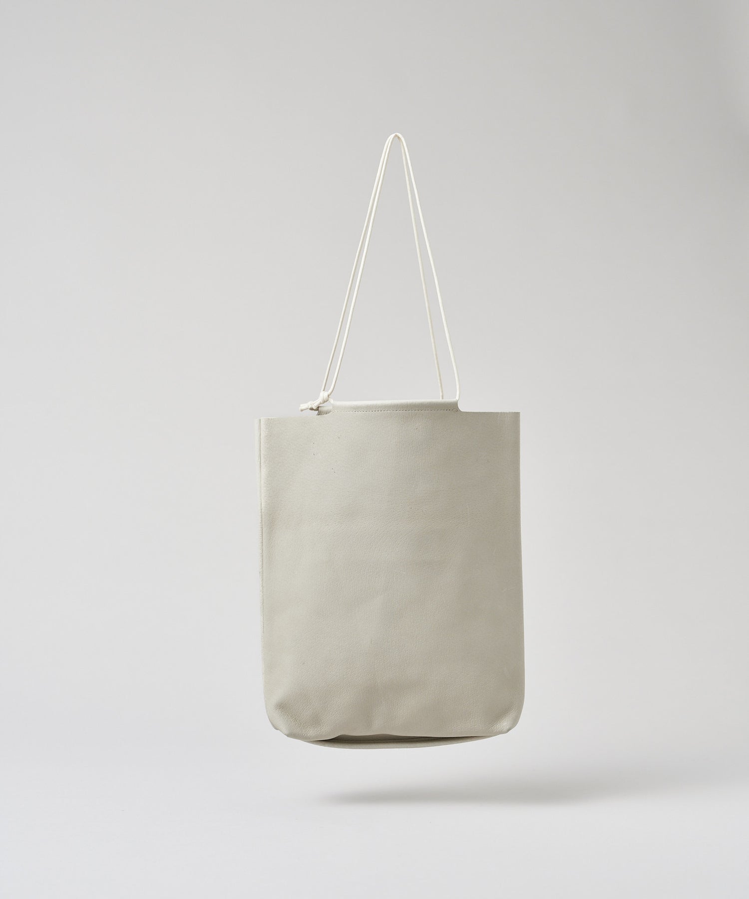 小ぶりなボディにストリングを通した、ミニマルな構造の「ミニトート」。小柄な方が手に提げても地面に擦れる心配はありませんし、肩掛けして持つこともできます。