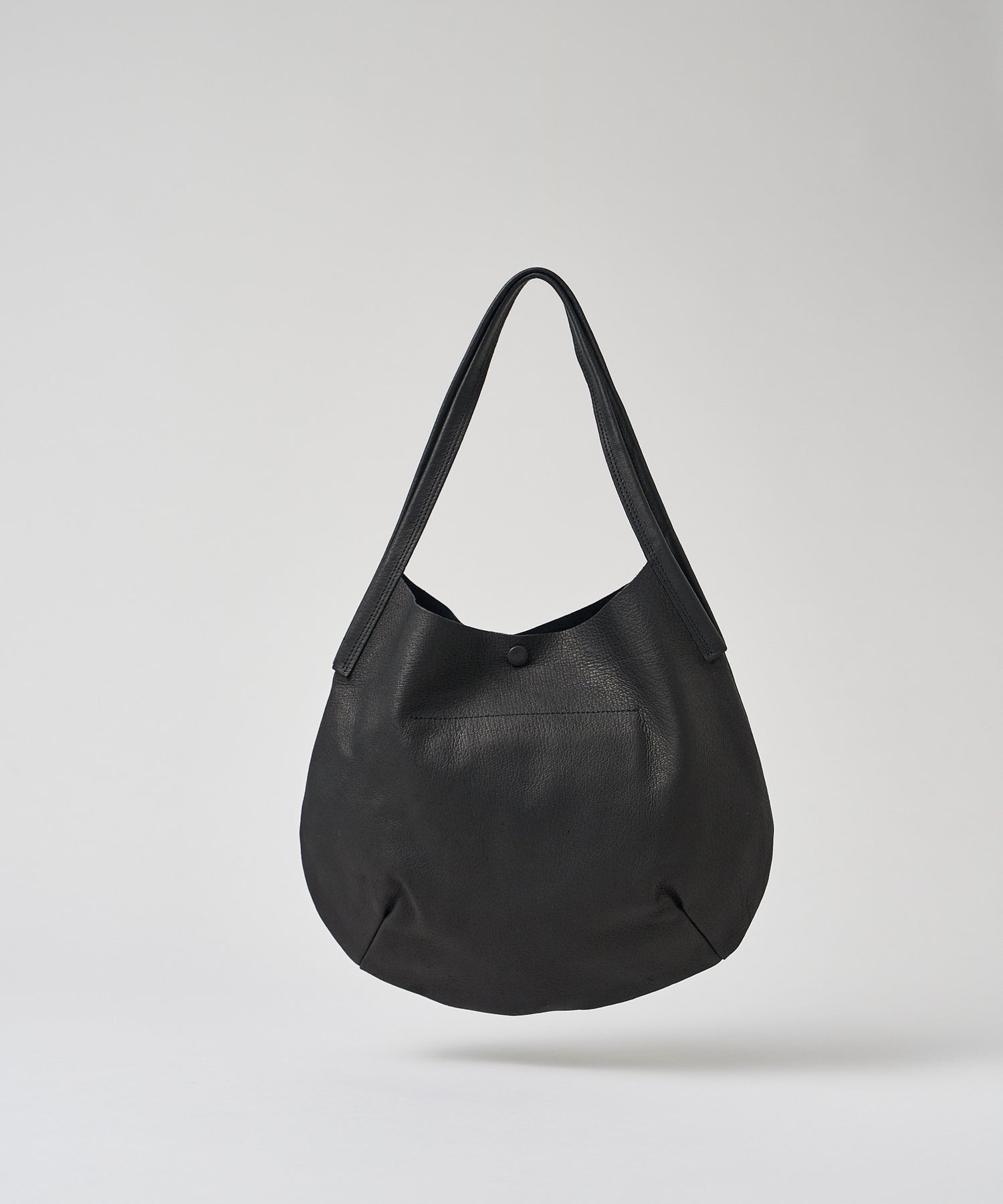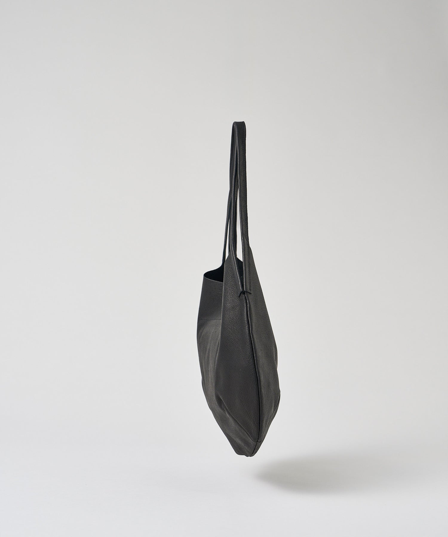 「サークルトート」は、切りっぱなしの一枚革を使うことで生まれる、工業製品のようなぺたんと平たいルックスが特徴。