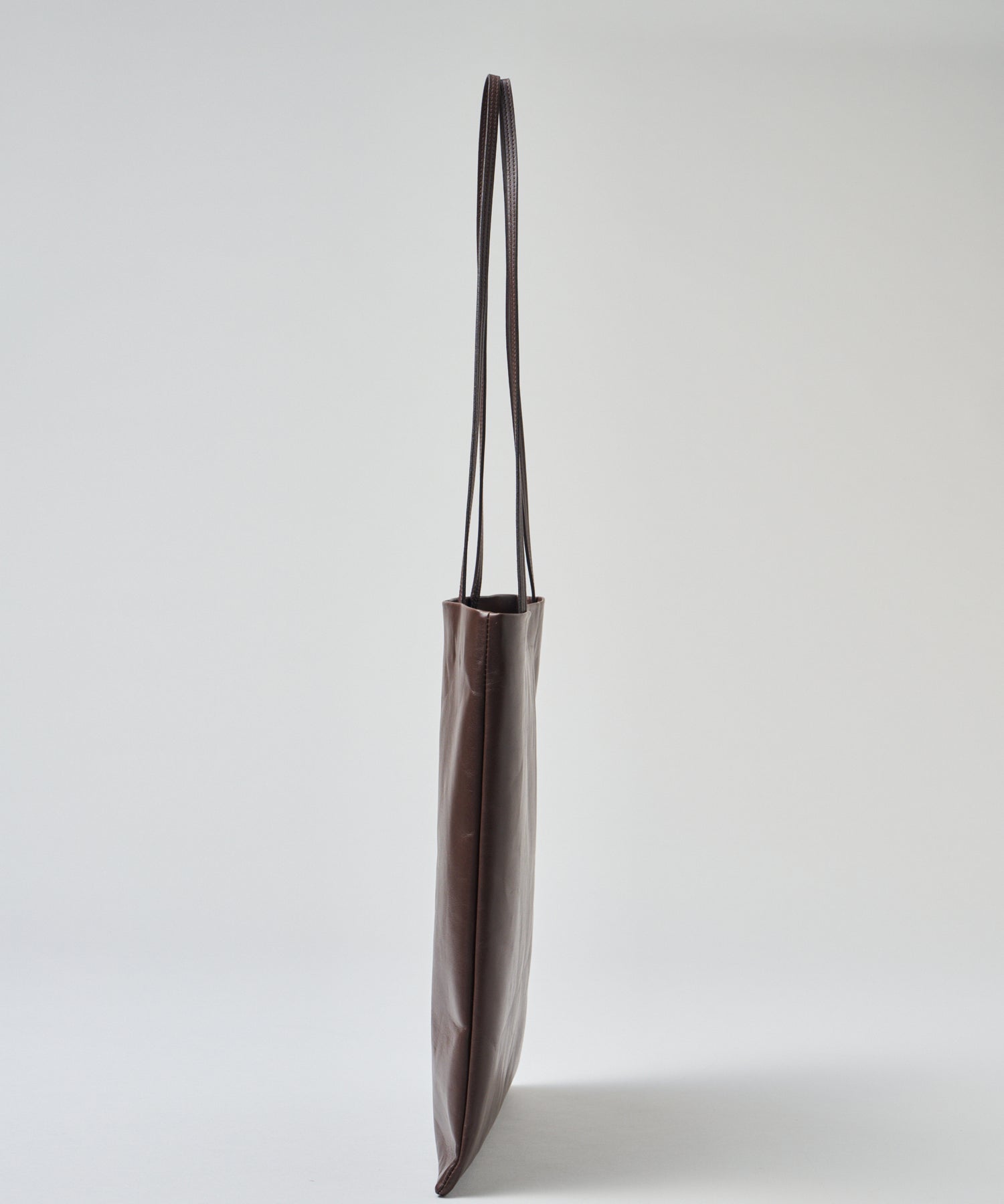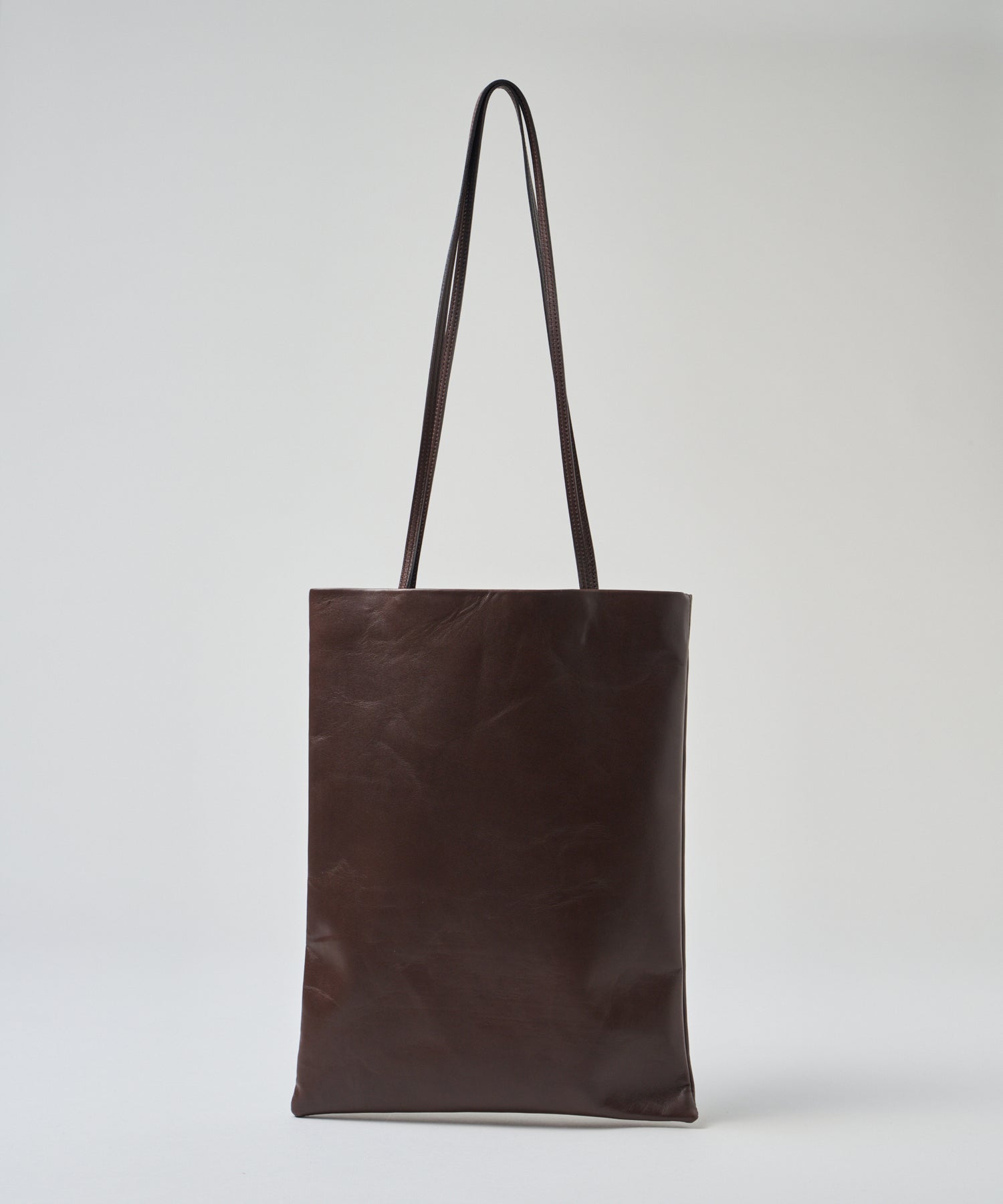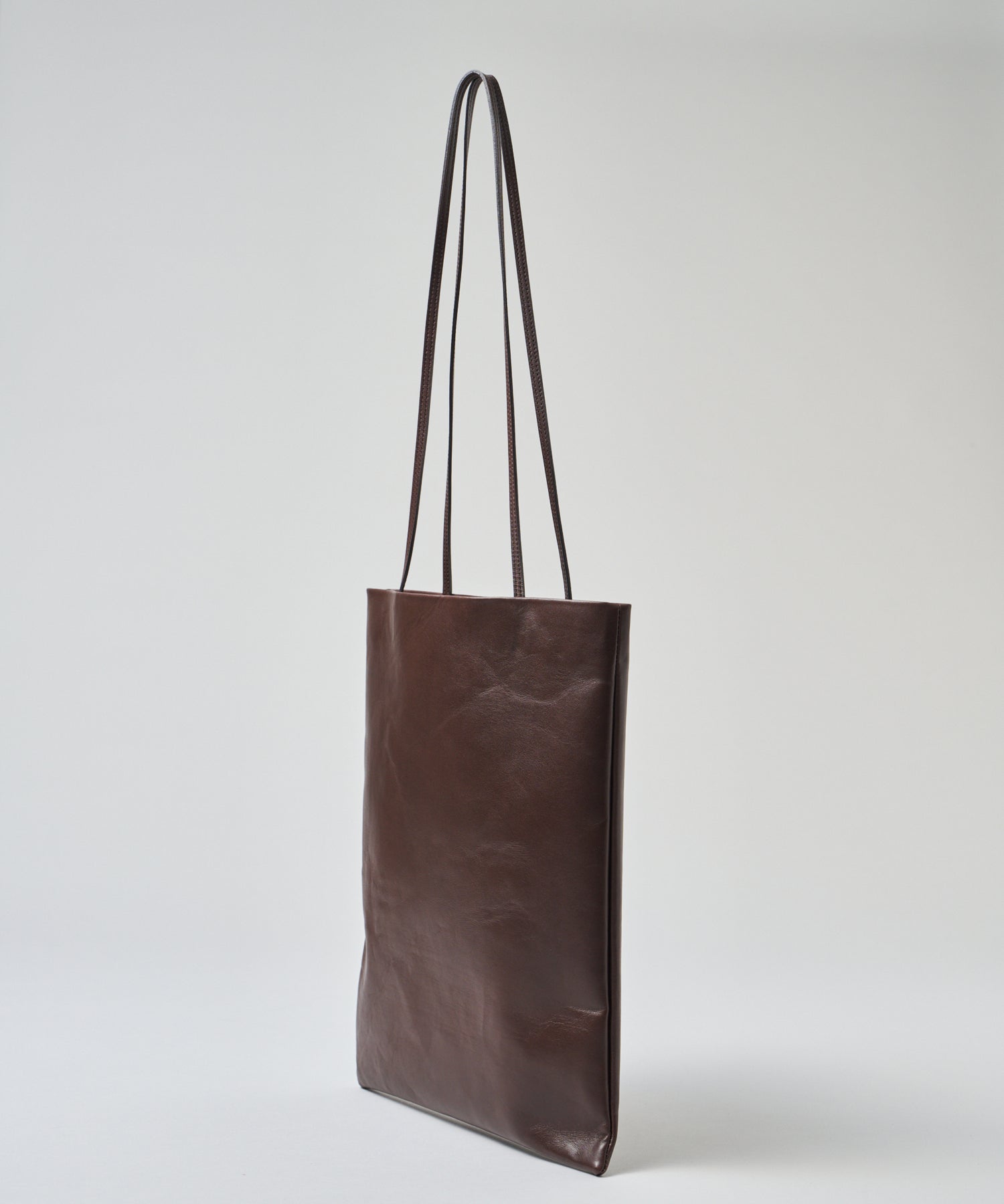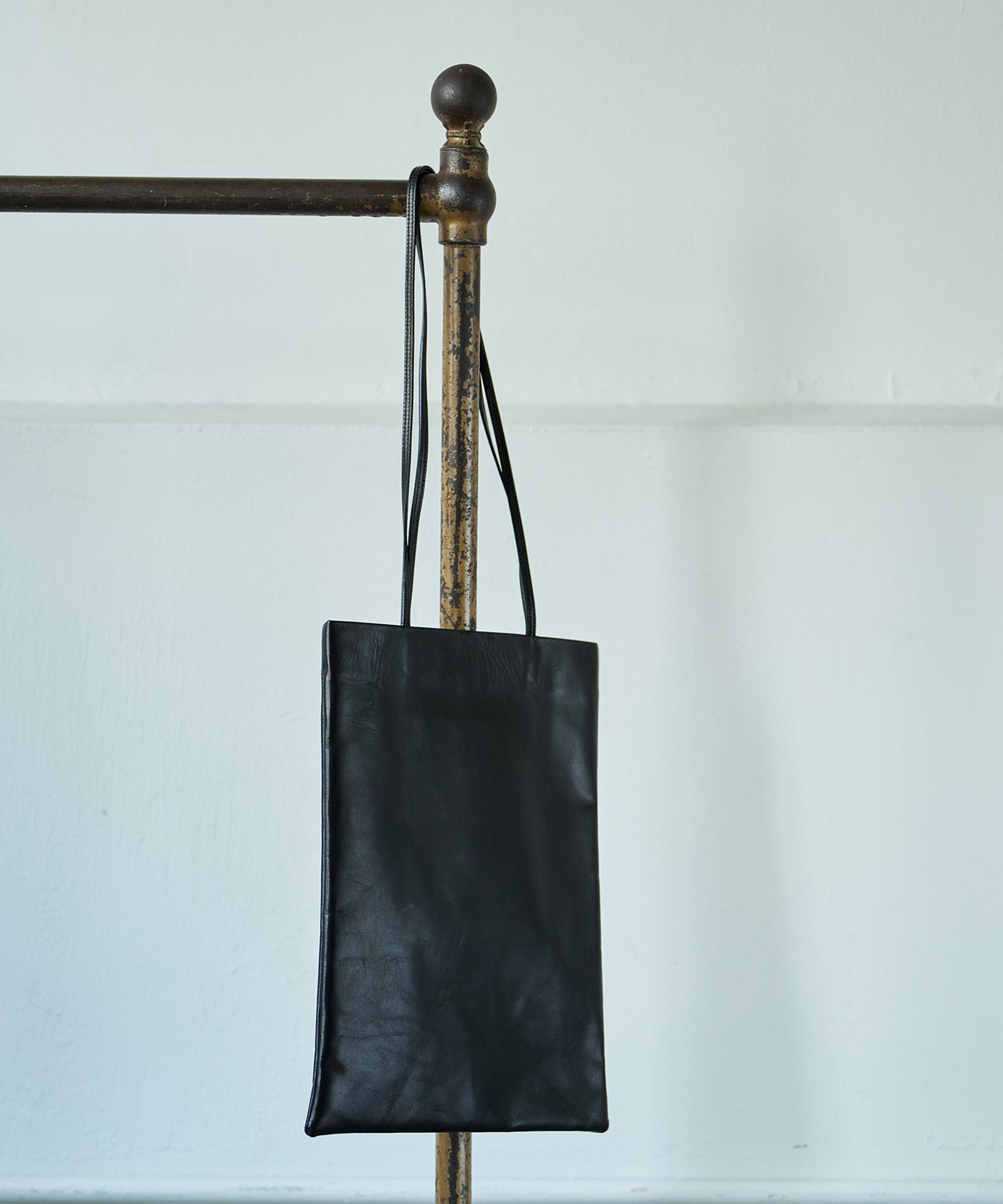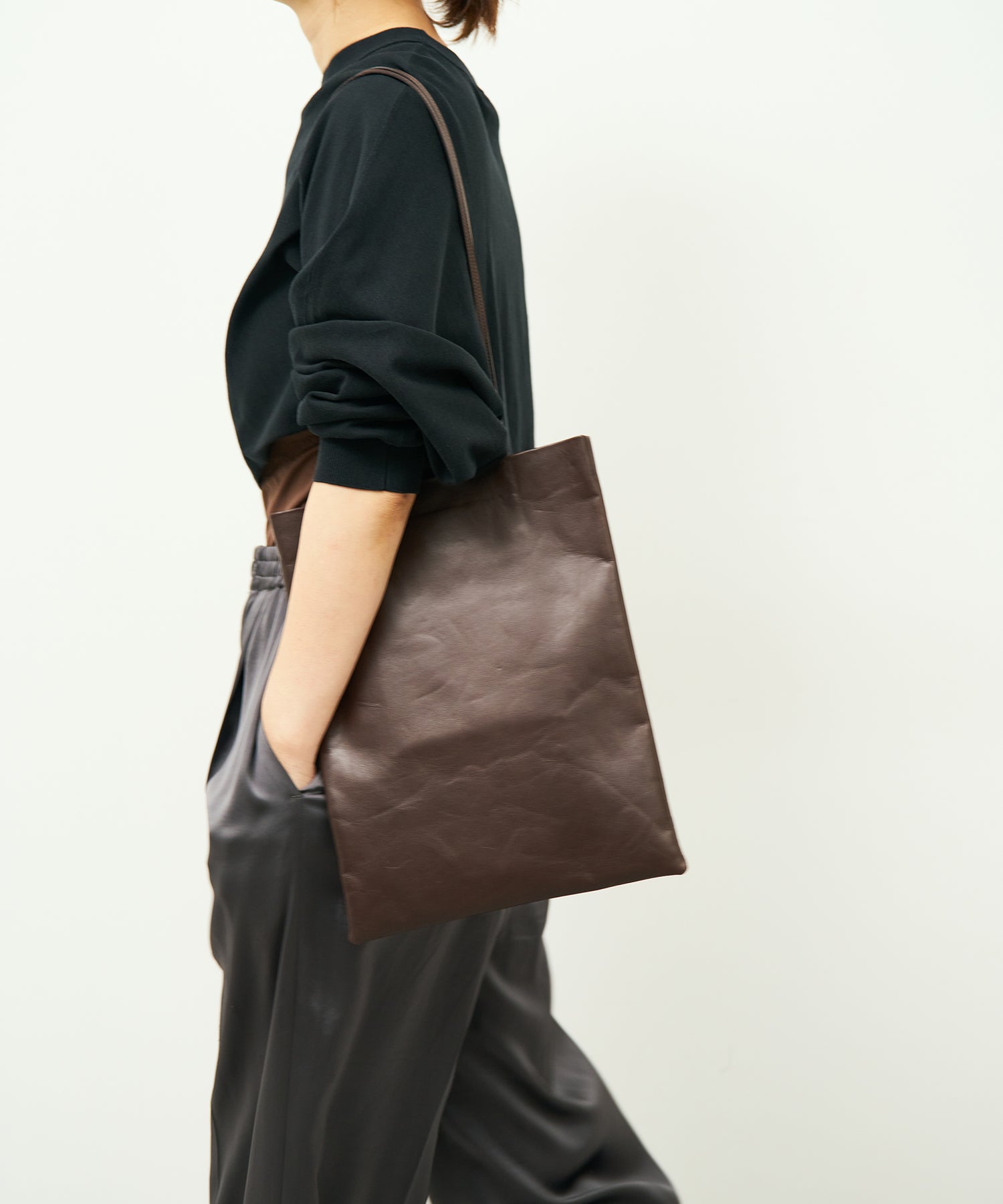 華奢で長めのハンドルは、ストレスなく自然に肩掛けでき、また、腕まわりを美しく見せます。フラットなデザインと相まって、2個持ちしたとしても嵩張らずすっきり。手に提げるには長いですが、くしゅっとまとめて持ったり、手首に巻きつけて持ったり、工夫次第です。