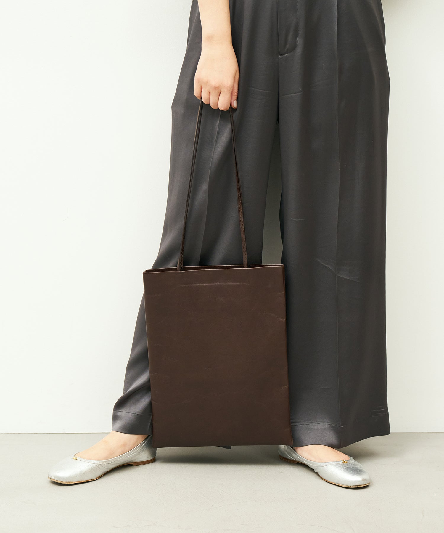 「フラッグトート」は、無駄を削ぎ落とした端正なかたち。なんといっても、飾り気のない美しさを感じさせるのは、たとえばミシン目を出さない工夫にあります。口元は折り返して接着し、ハンドルの縫い付けは見えない内側でおこなっています。