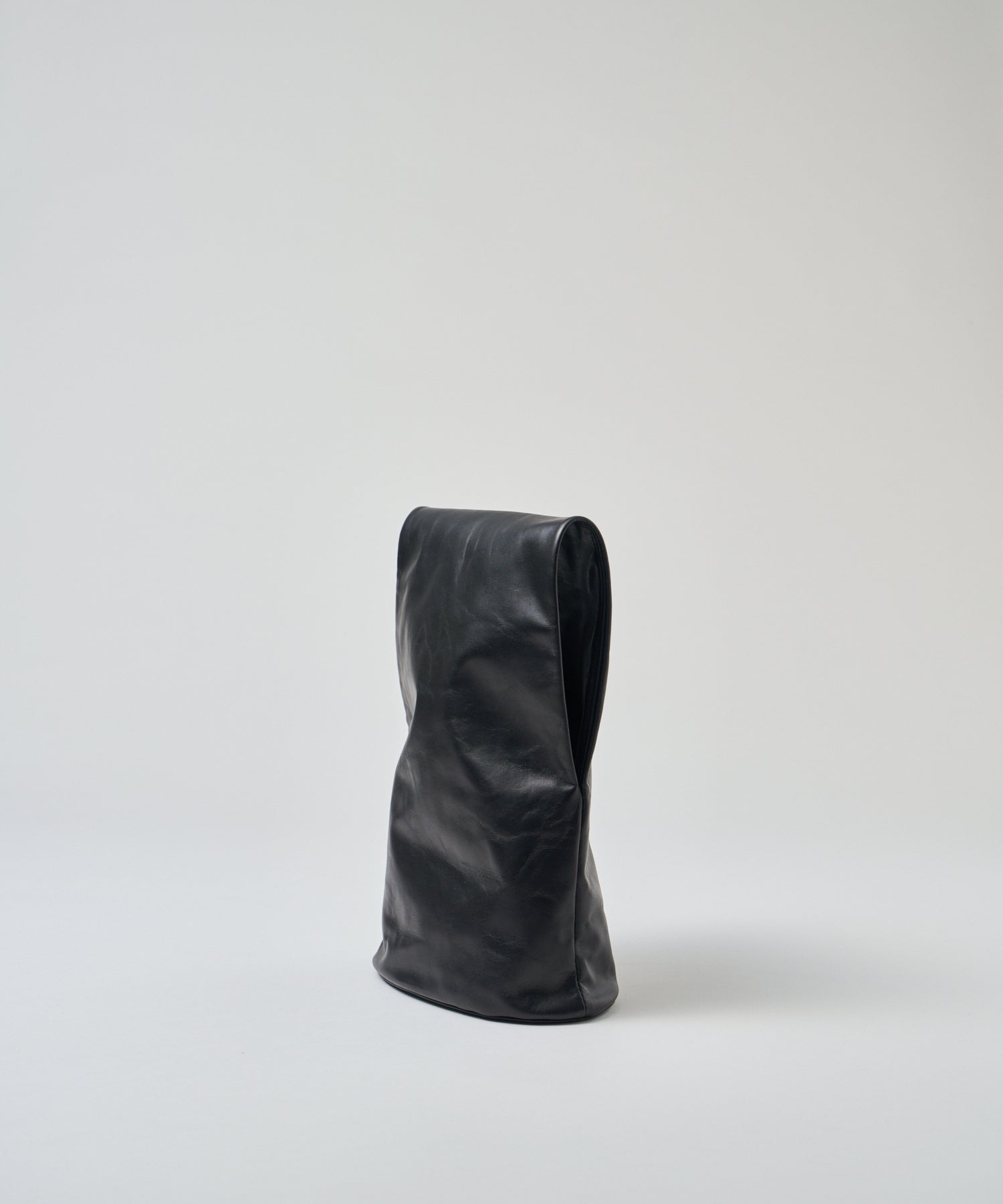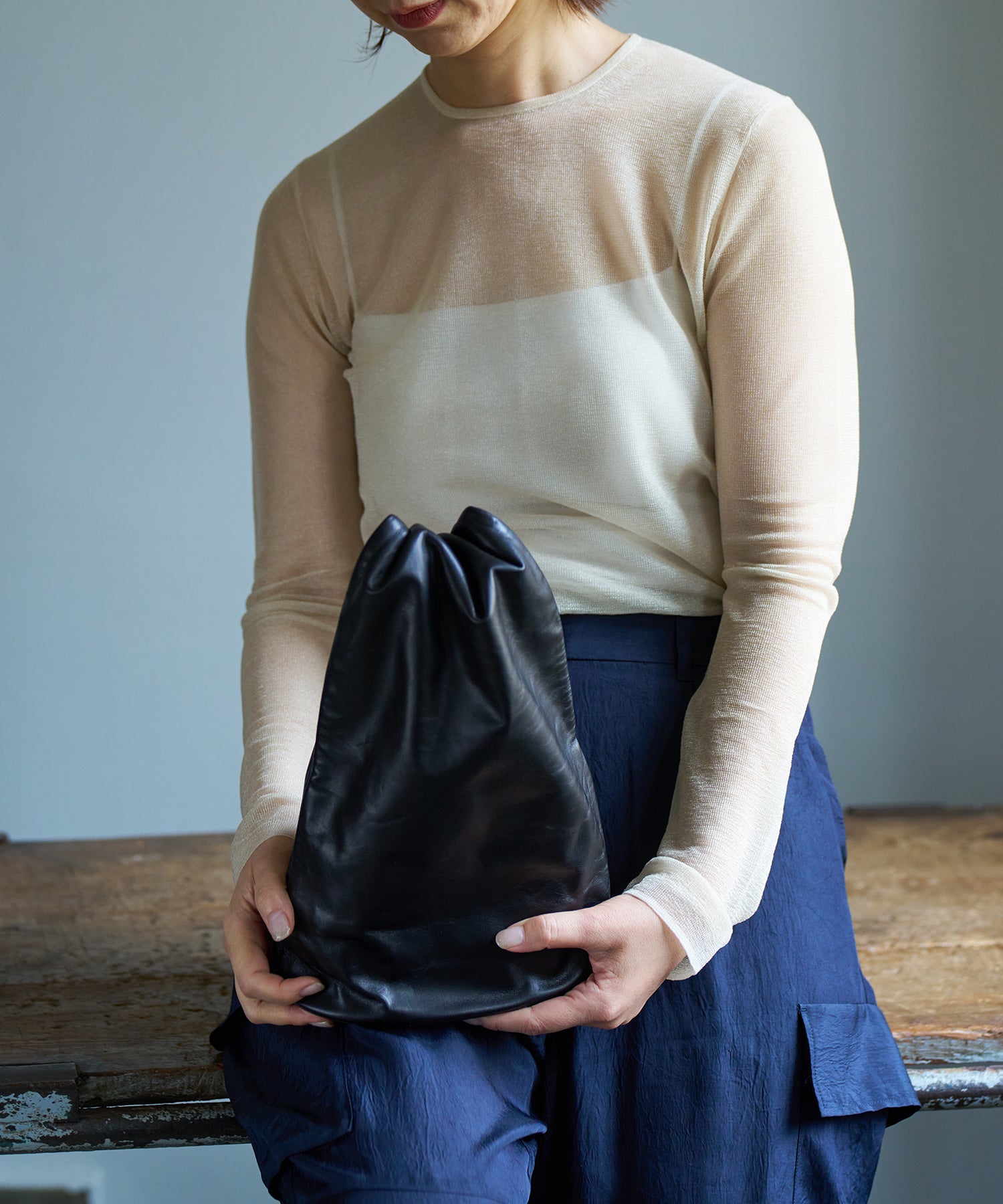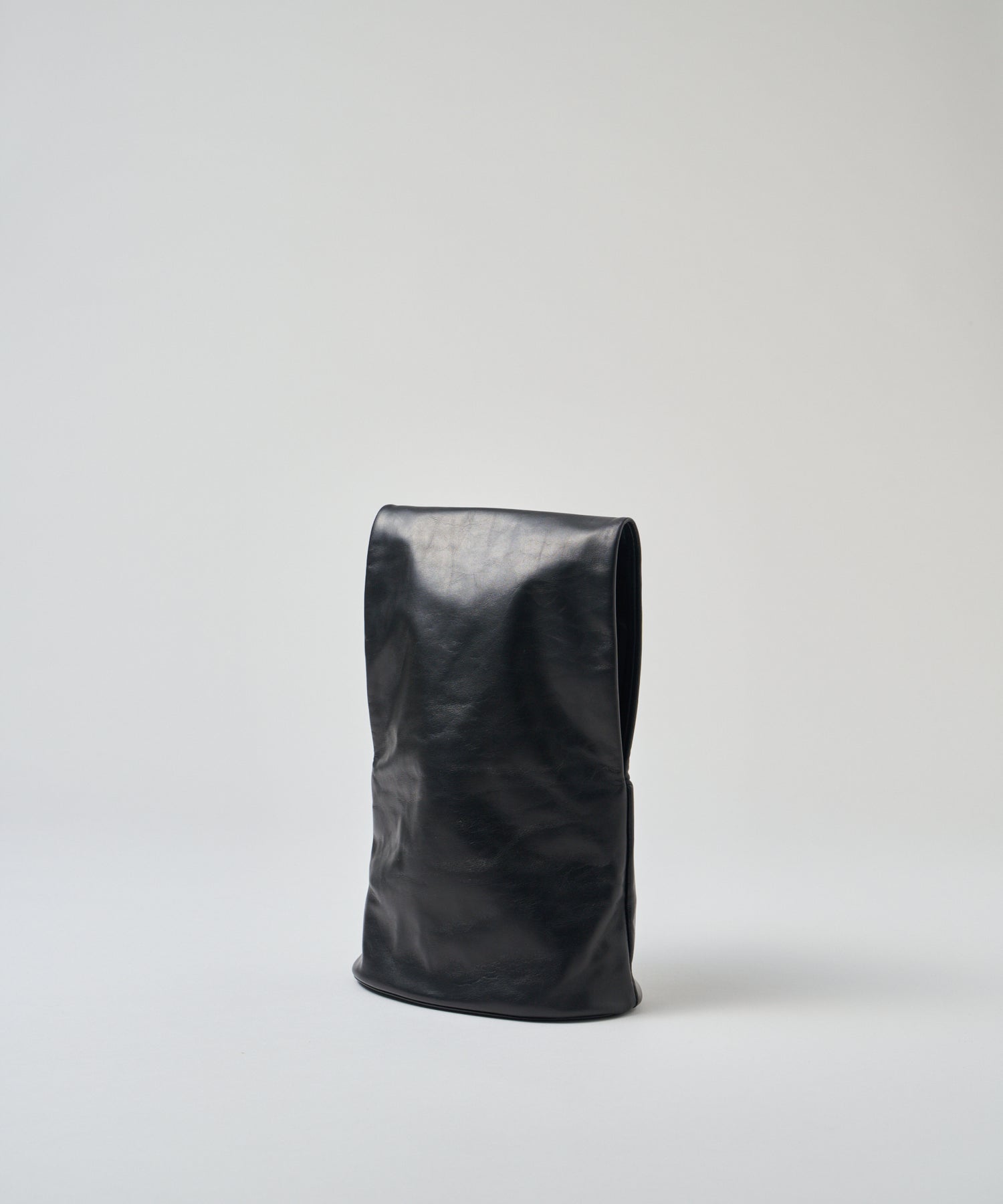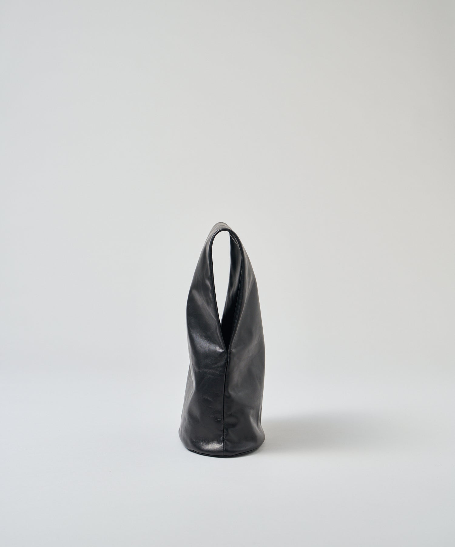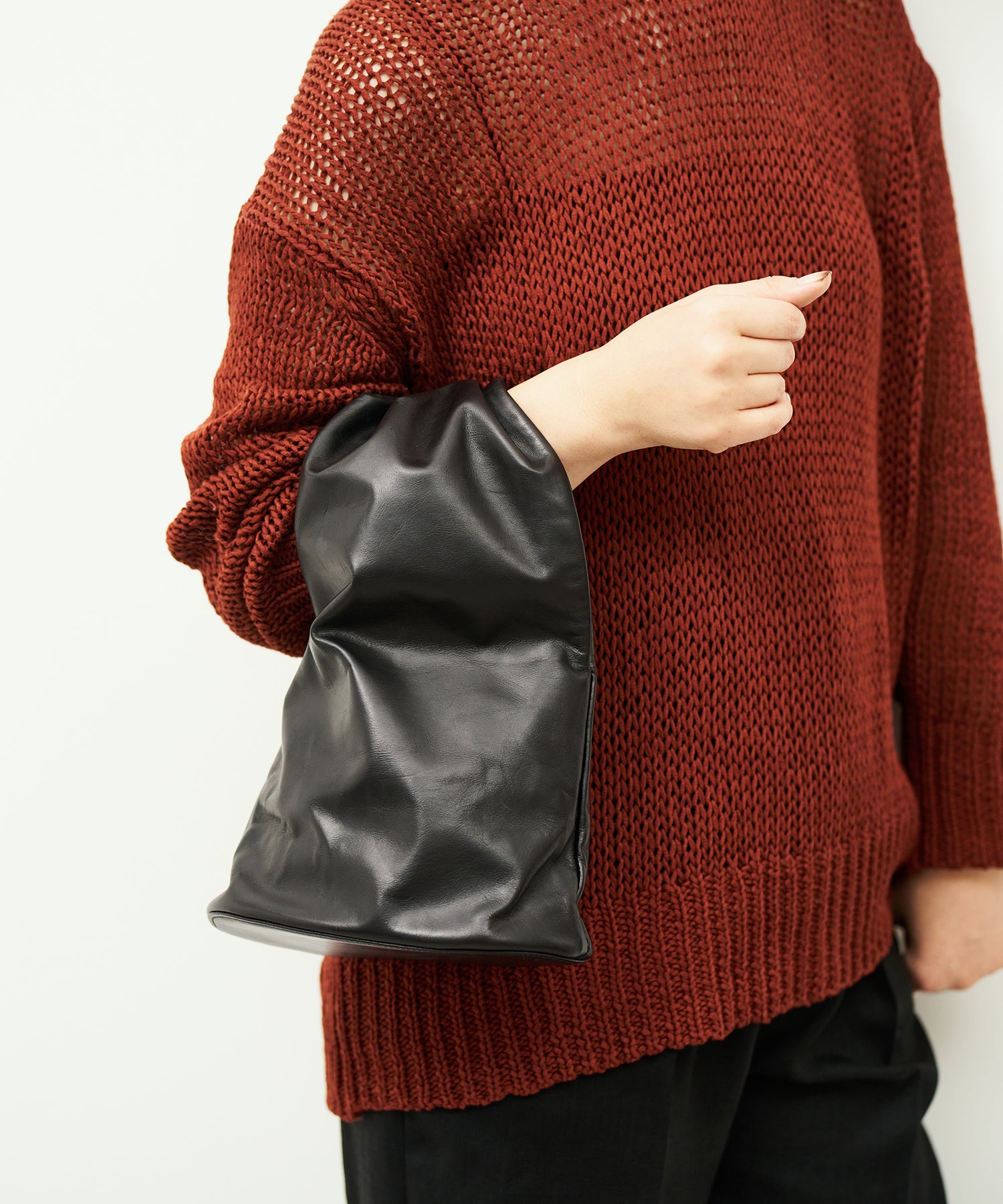 収納部分はバッグの下半分、そこからひと続きになった上部全体がハンドルです。上部はトンネルのように大きく開いた筒状で、腕を通してもたっぷりと余裕のある設計。くしゅっとまとめて手で握って持つこともできますし、上部を折りたたんでクラッチバッグのように持つこともできます。持ち方次第でさまざまな印象に。