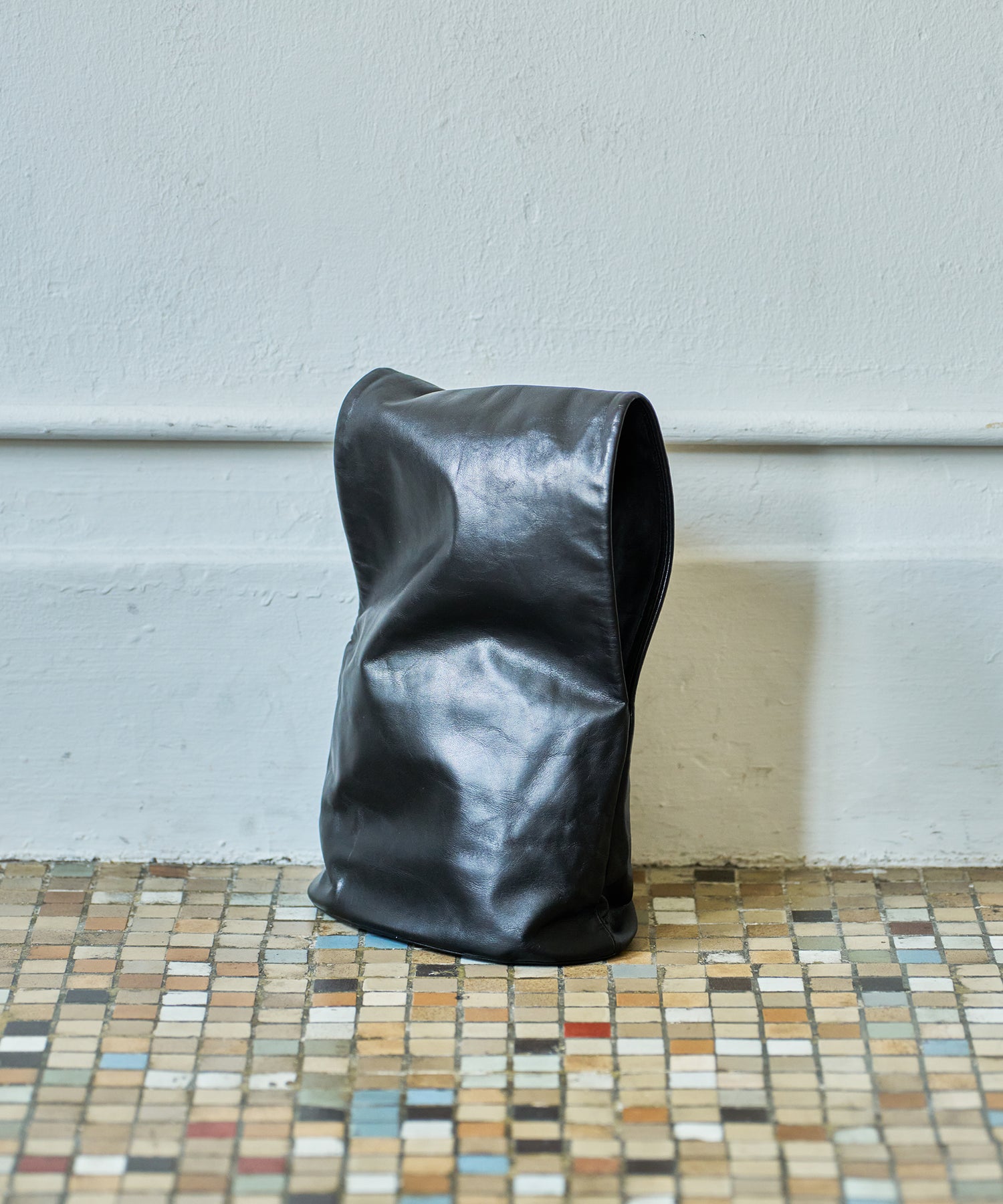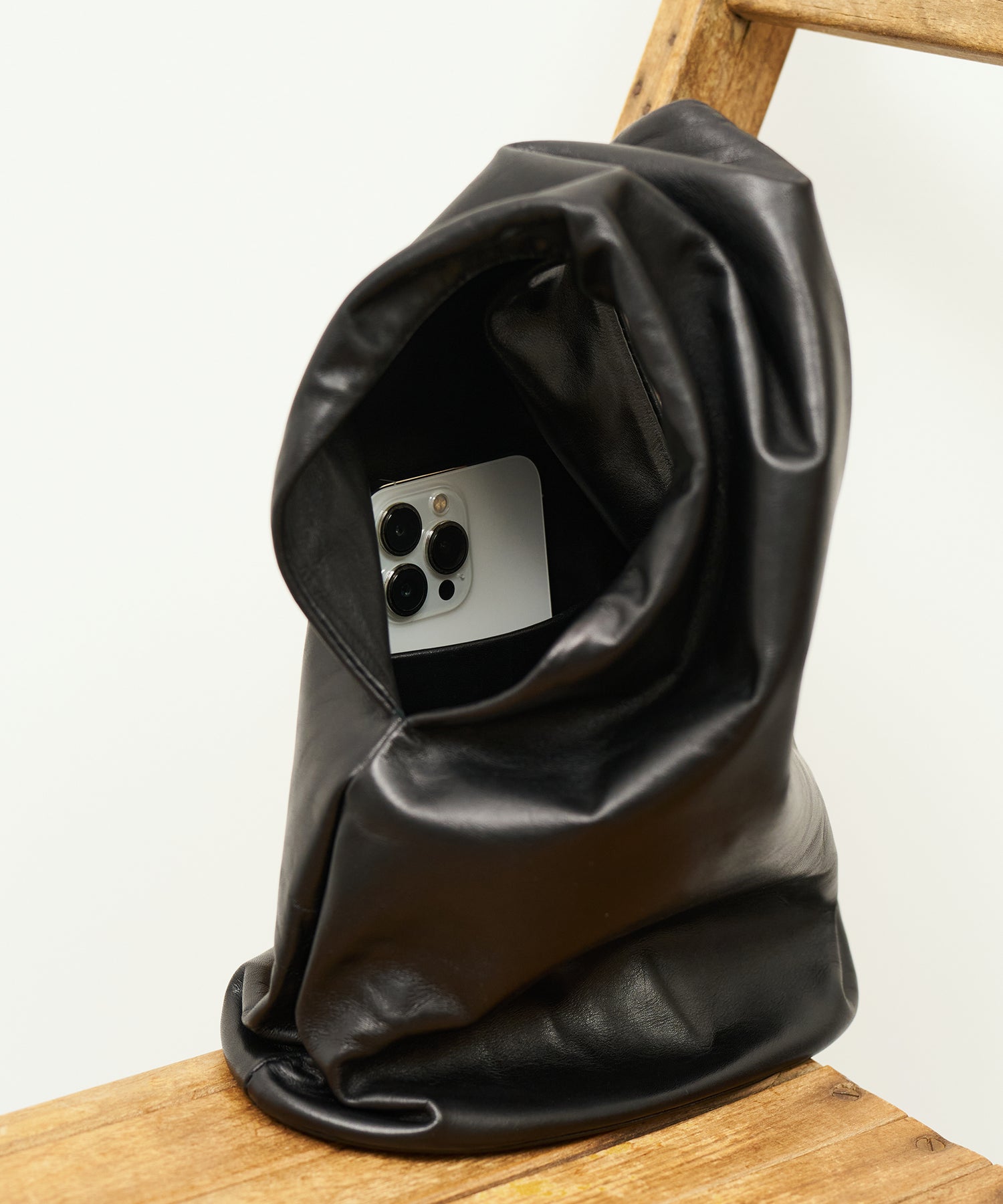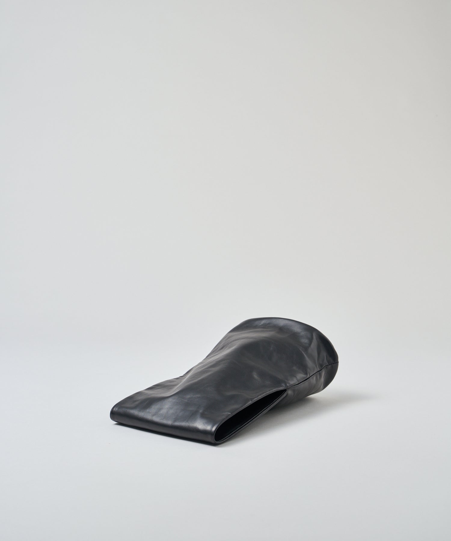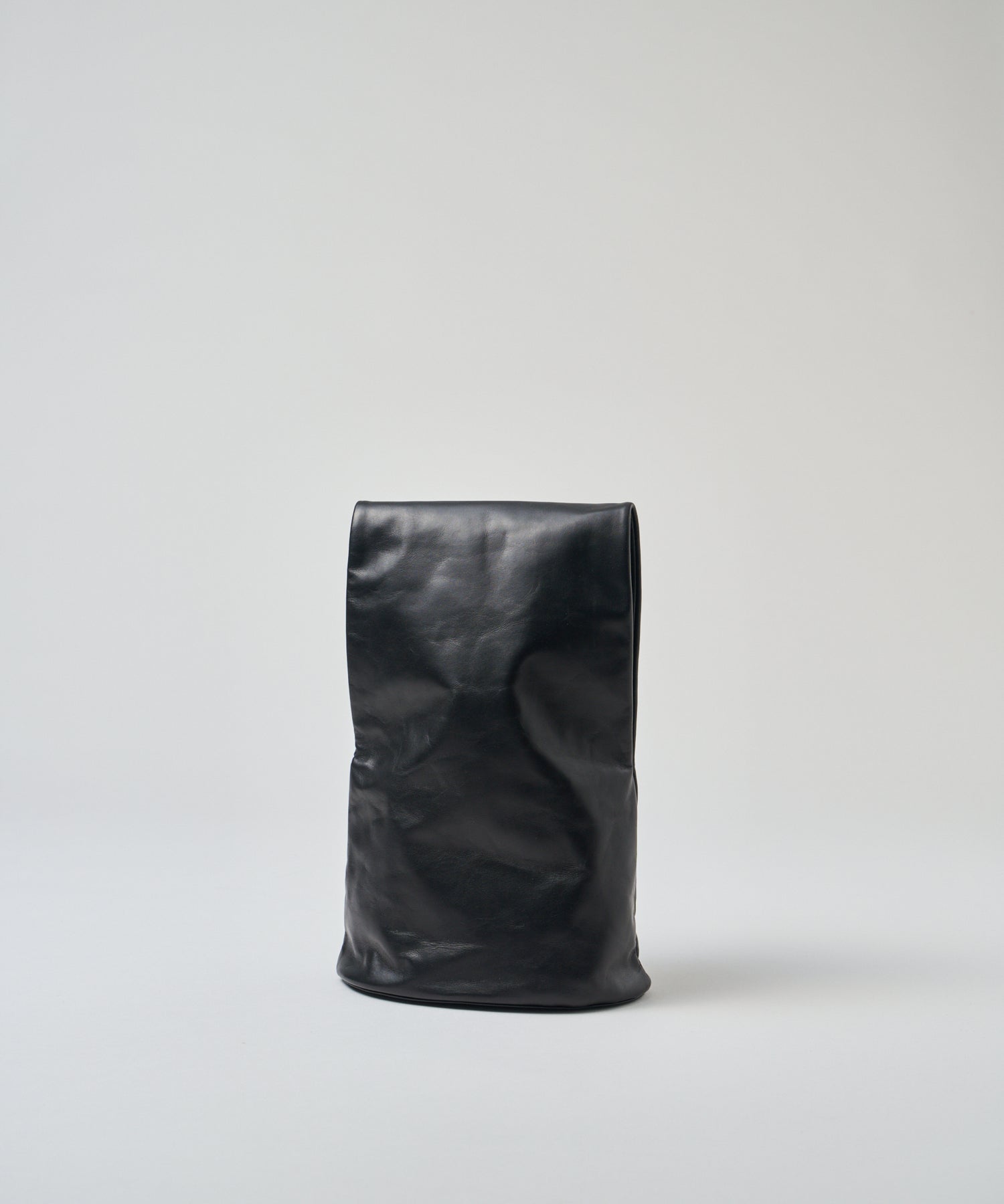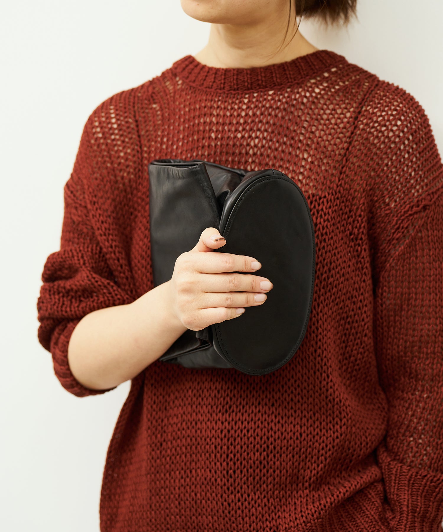 収納部分はバッグの下半分、そこからひと続きになった上部全体がハンドルです。上部はトンネルのように大きく開いた筒状で、腕を通してもたっぷりと余裕のある設計。くしゅっとまとめて手で握って持つこともできますし、上部を折りたたんでクラッチバッグのように持つこともできます。持ち方次第でさまざまな印象に。