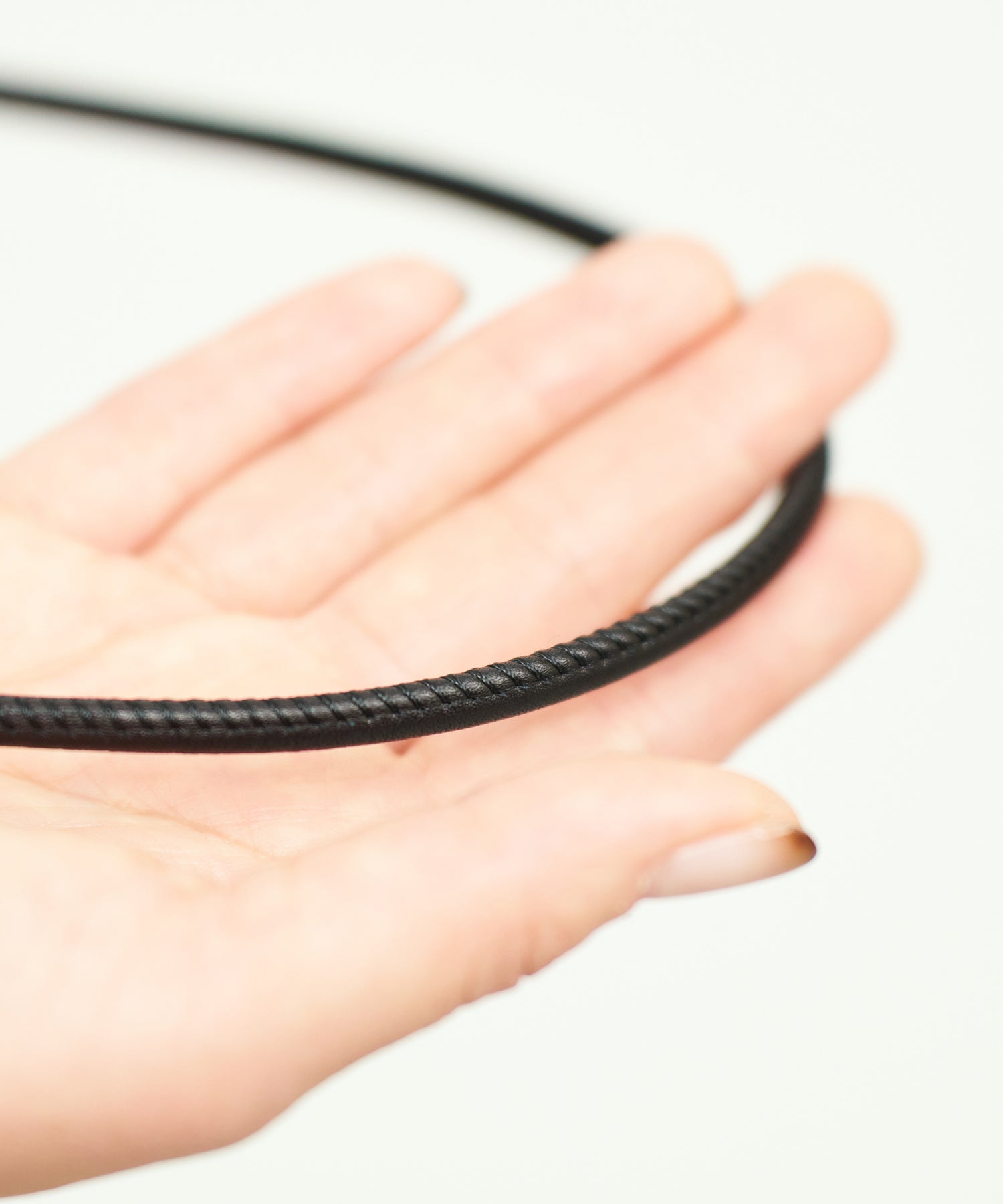 ショルダーストラップは丸紐タイプ。ボディ側面中央付近の穴に通してあるため、どこか浮遊感のある見え方に。紐の端を好きな位置で結ぶことで、長さの調整ができます。