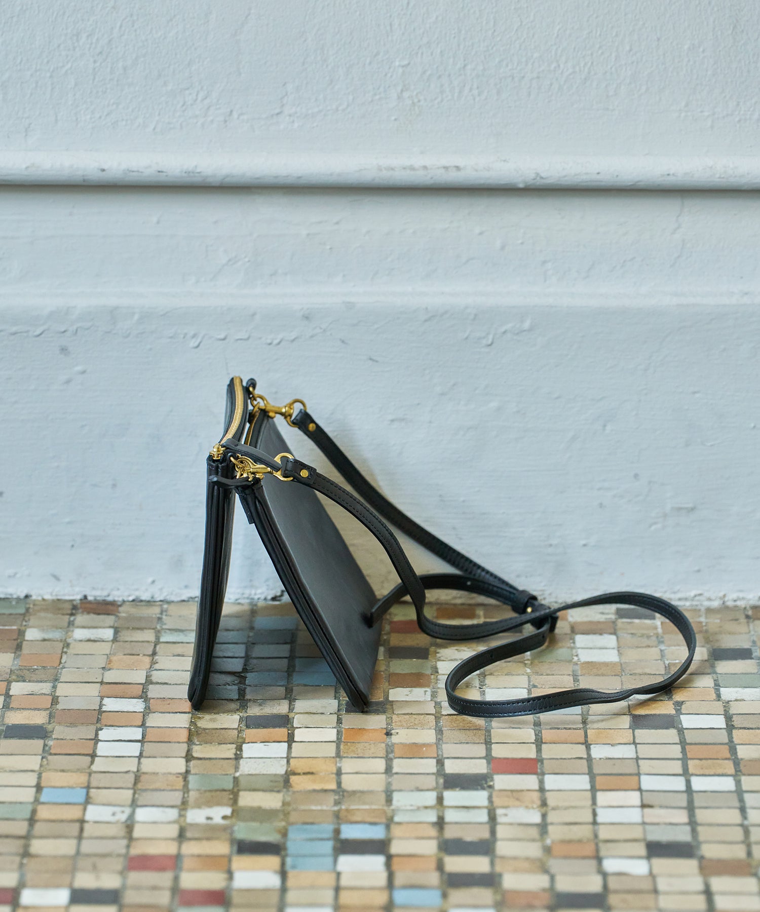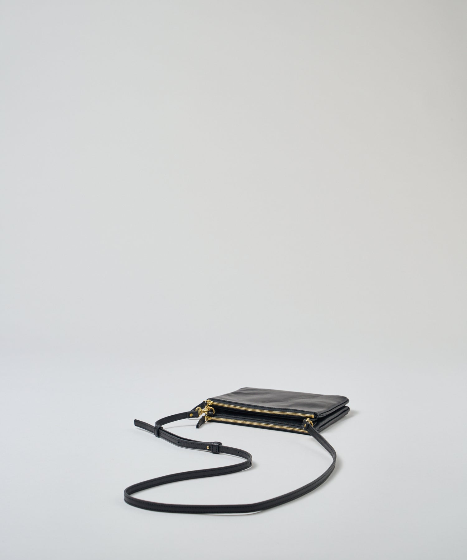 コンパクトなふたつのポーチを、ショルダーストラップで連結したようなかたちの新作「バタフライショルダー」。