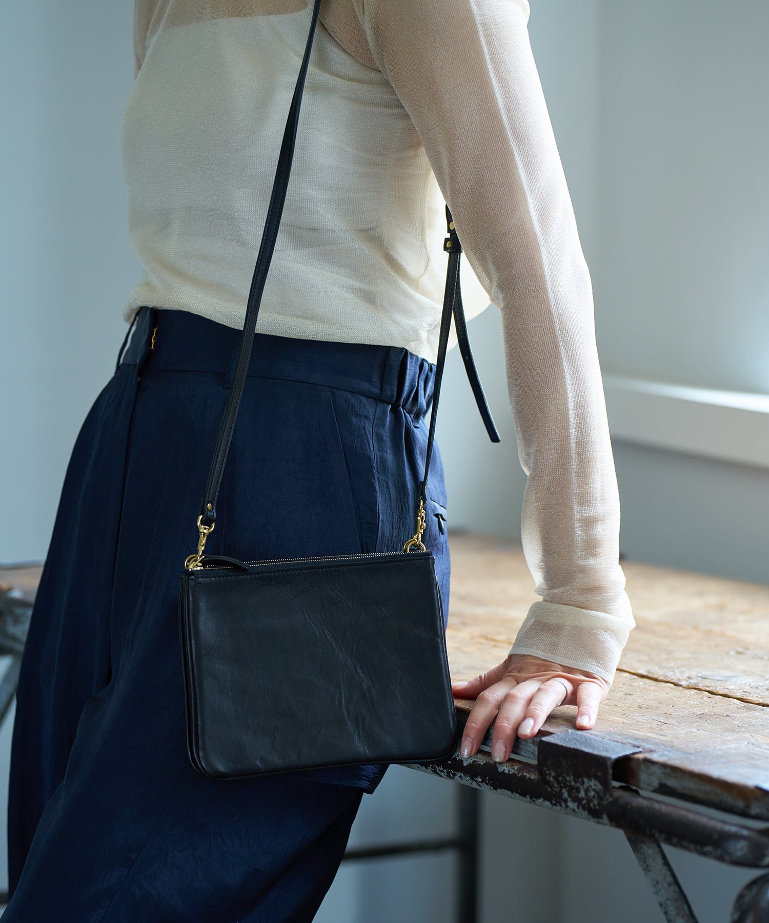 そんなふうに“取り外せるポーチ”としても便利ですが、かといって、「ポーチにストラップをつけただけ」に見えないのは、ポーチ側面にパイピングを挟み込んだ玉縁のデザインゆえ。見た目も、きちんと“バッグの佇まい”に。