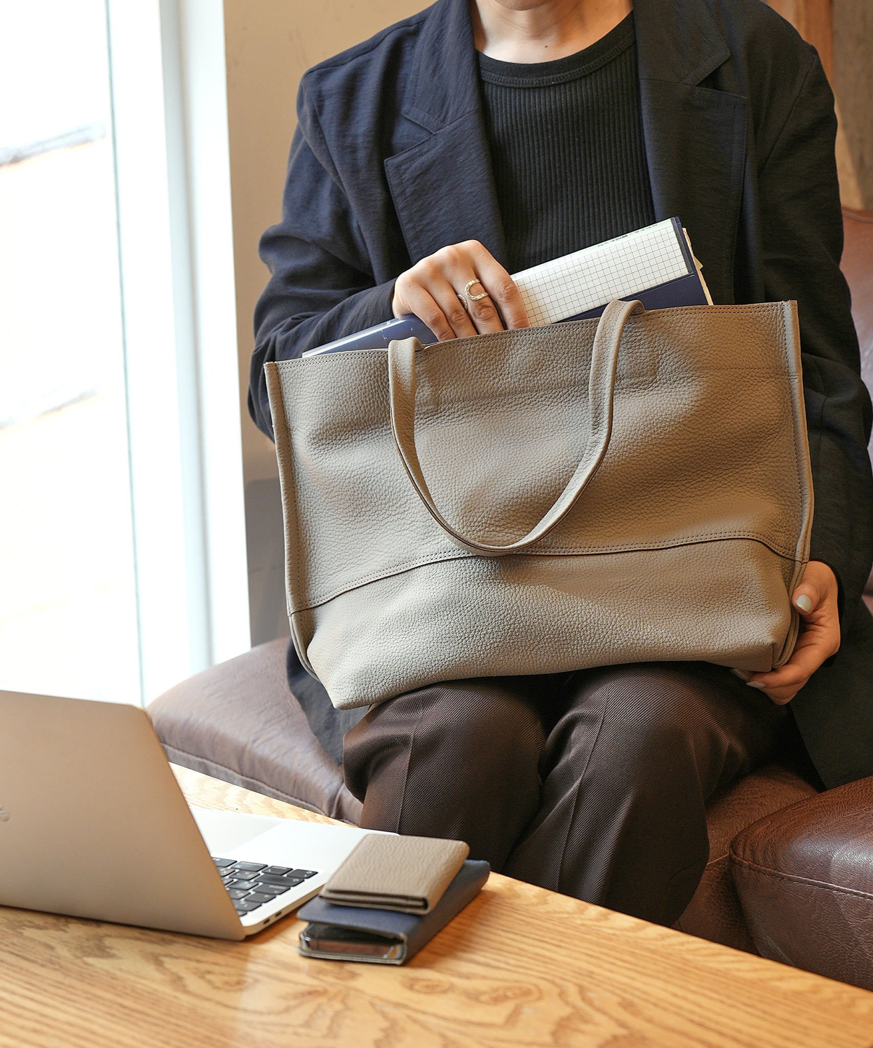 人がバッグを持ったときの、人とバッグのバランス。ワイドトートもそんな視点から、ハンドルの長さや全体のバランスが設計されています。肩にかけたときも、手に下げたときも、どちらもバランスよく。そして、どんな人にも馴染むこと。