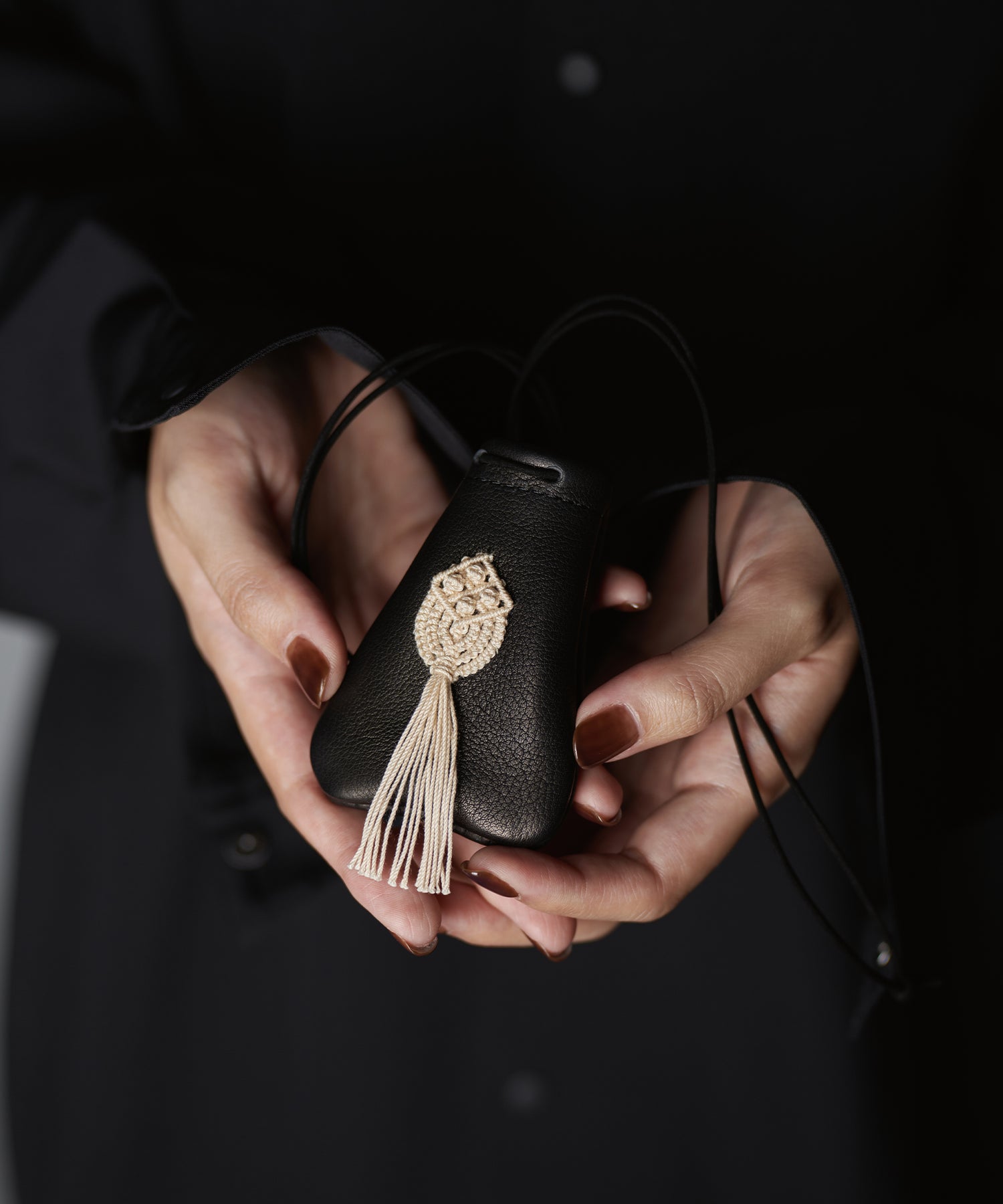 そして、今回RENのレザーと、松田さんの感性豊かなアクセサリーが響き合うものを作りたい。そんな想いから生まれたのが、この「アミュレットポーチ」。素材には、上質なベビーバッファローレザーを採用。カジュアルになりすぎず、品格を保ちながら、様々なスタイルに溶け込むよう仕上げました。