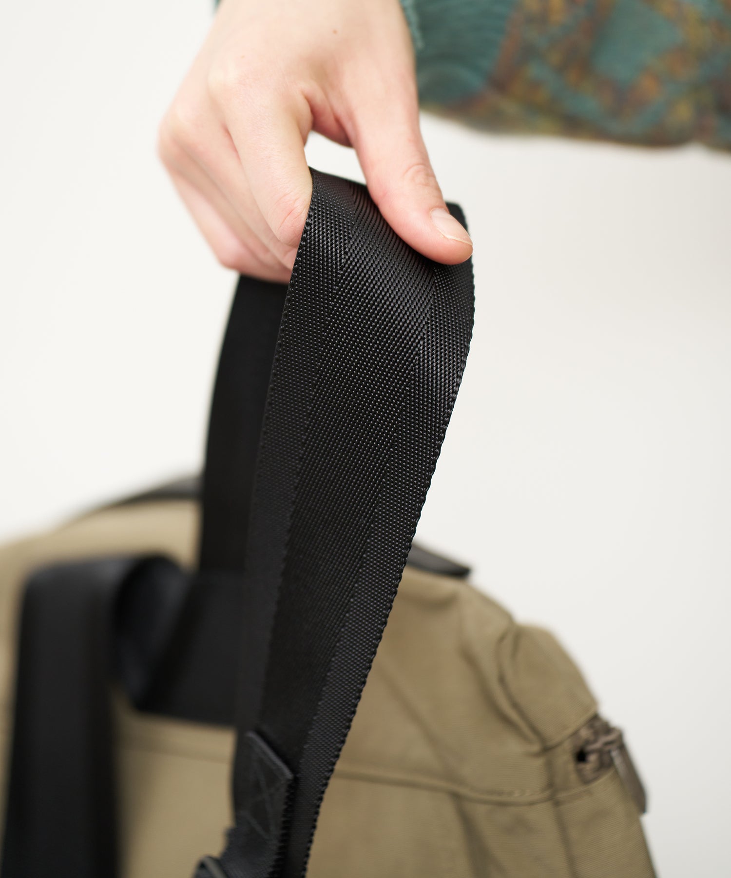 あえて肩にはかけず、手に持ってコーディネートするのもおすすめです。ハンドル部分には、伸びにくく強度のある牛革を使用。ブラックの牛革がシックな雰囲気を演出します。