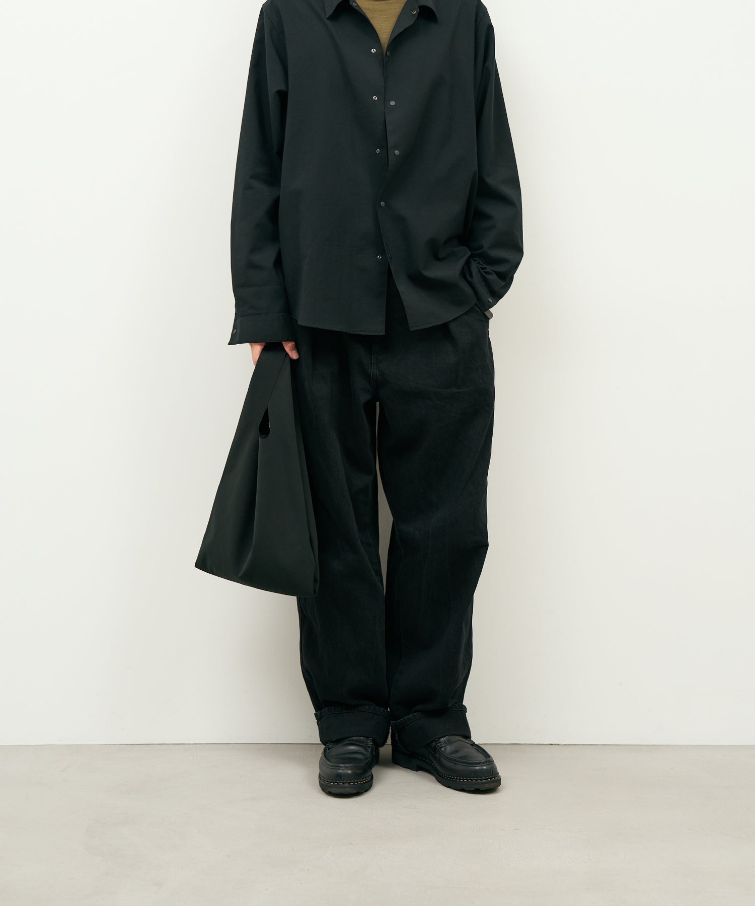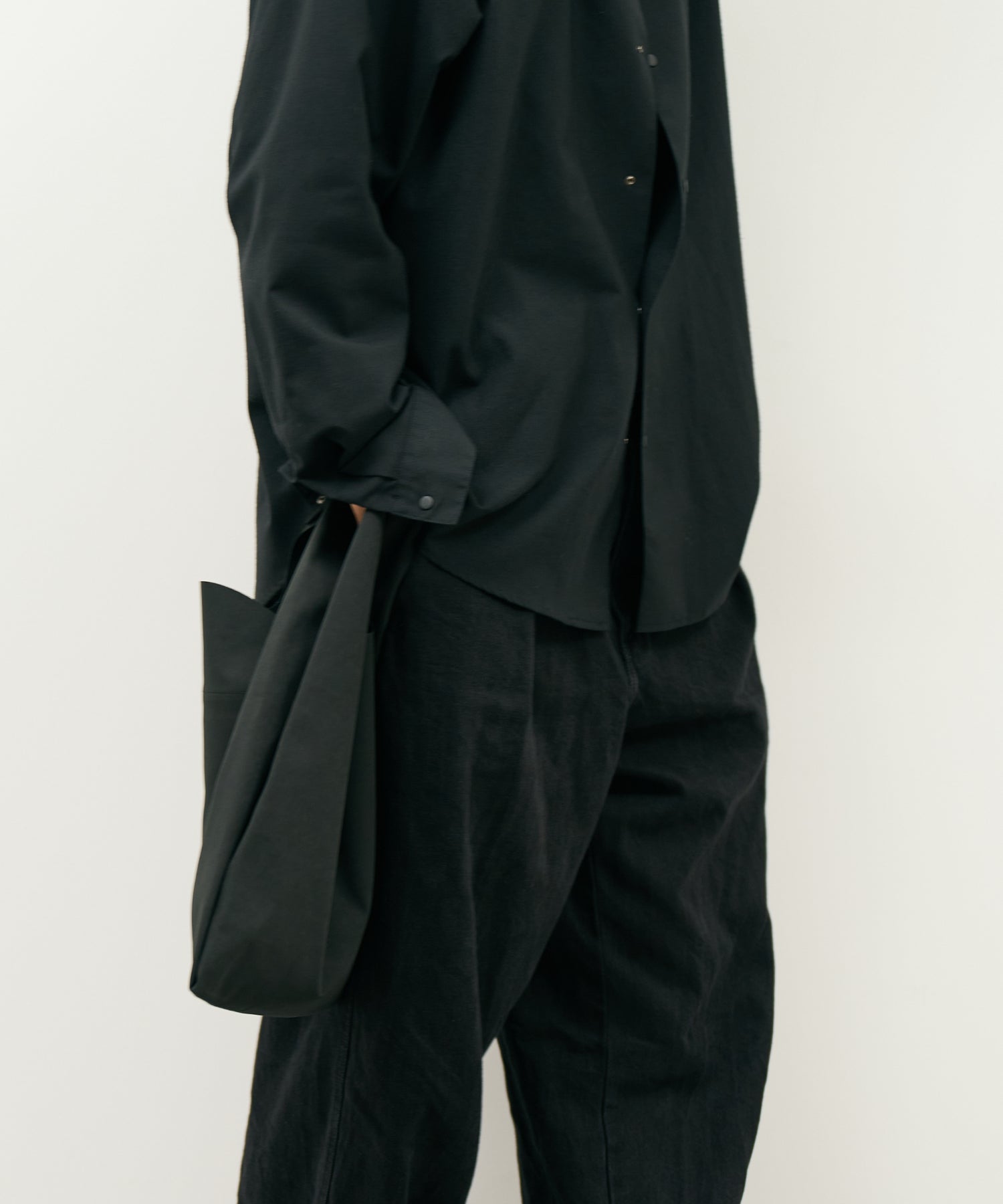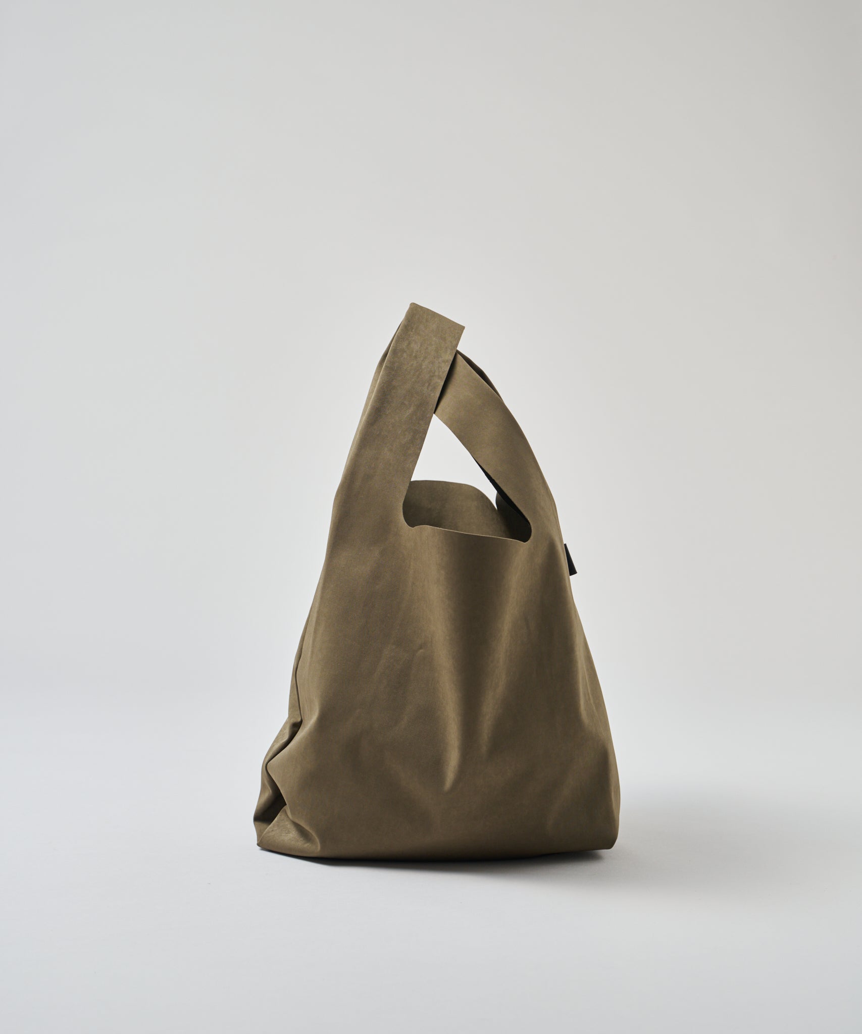 暮らしに馴染み深いプロダクトである「レジ袋」がデザインモチーフ。切りっぱなしの部分をあえて処理しすぎず、ステッチを表側に極力出さないよう、シンプルに仕上げています。