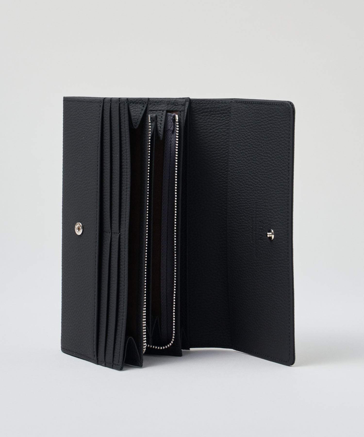 フラップを開くと、小銭入れ、お札入れ、カードの収納スペースがいちどに見渡すことができます。お会計の動作も、スマートに。