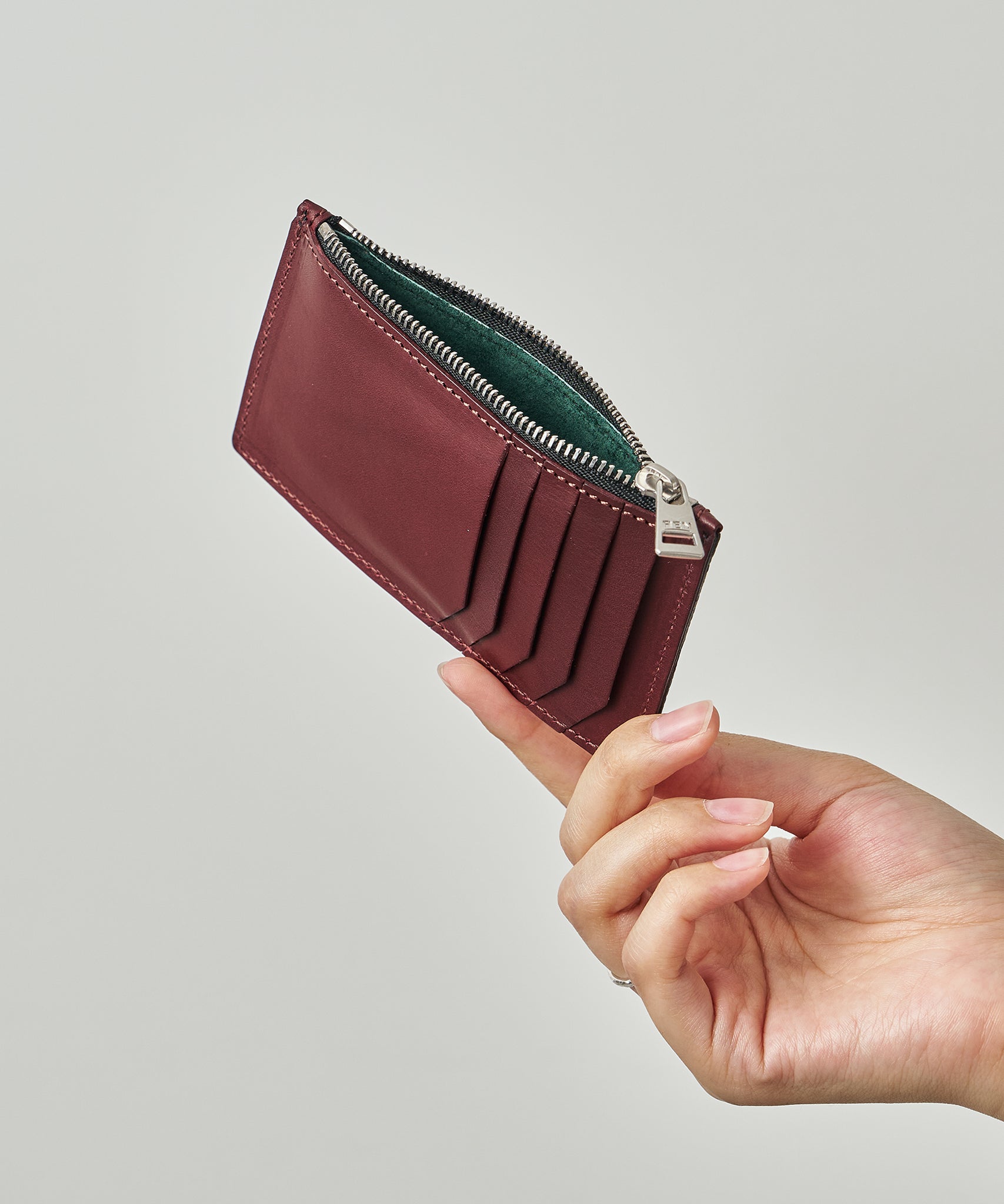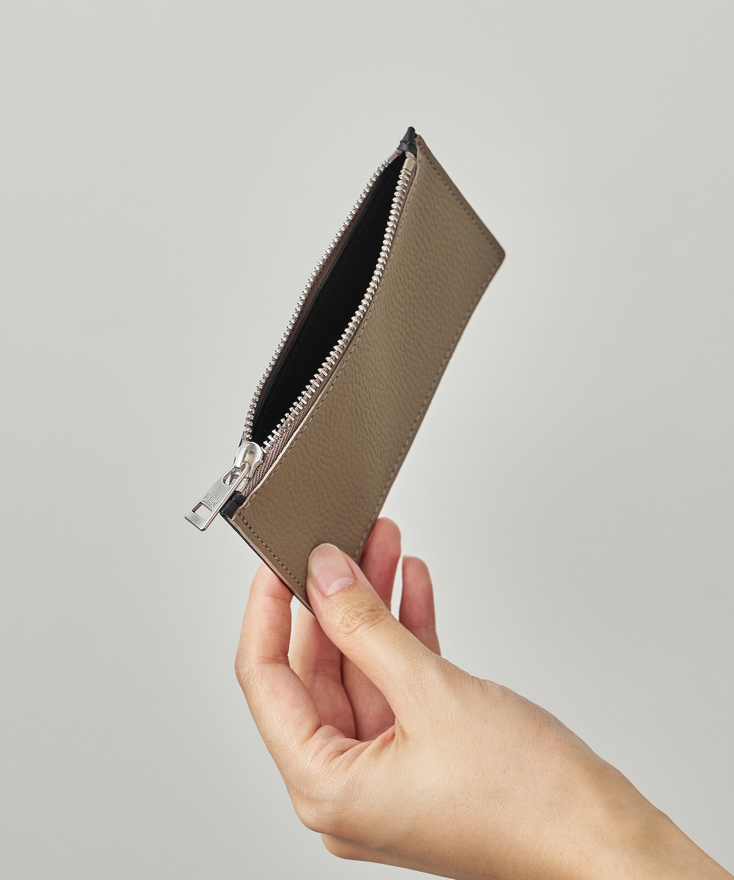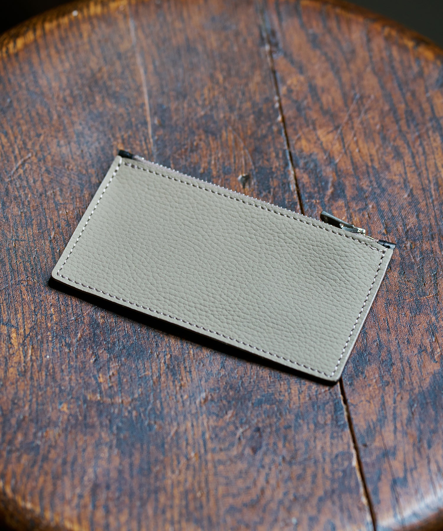 クロム鞣しを施し、銀面(表面)には端正なシボを型押ししたカウレザーです。薄くコーティングをかけ顔料仕上げにすることで、撥水性も持たせています。そのため、経年による変化もほとんど起こりません。変化を楽しむより、気兼ねなく毎日使えることを目指した素材です。いっぽう、強い力が加わり革が伸びると、表面の顔料が割れていくことがあります。大きなバッグに大量に荷物を入れる場合など、ハンドル部分はとくに注意が必要。内側の革は伸びるのに顔料は伸びないためですが、それはとりもなおさず、本物の革を加工している証でもあります。また顔料仕上げのメリットは、カラーリングの小回りが利くことにも。毎回まったく同じ顔料があるわけではなく、革の面積や使う量で微妙に色合いが変わることもしばしば。その繊細さも含めて、私たちは魅力と感じています。