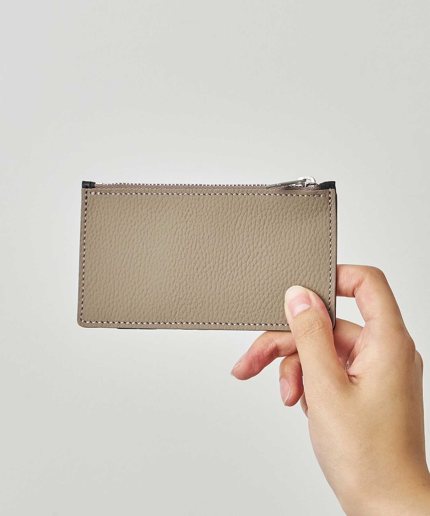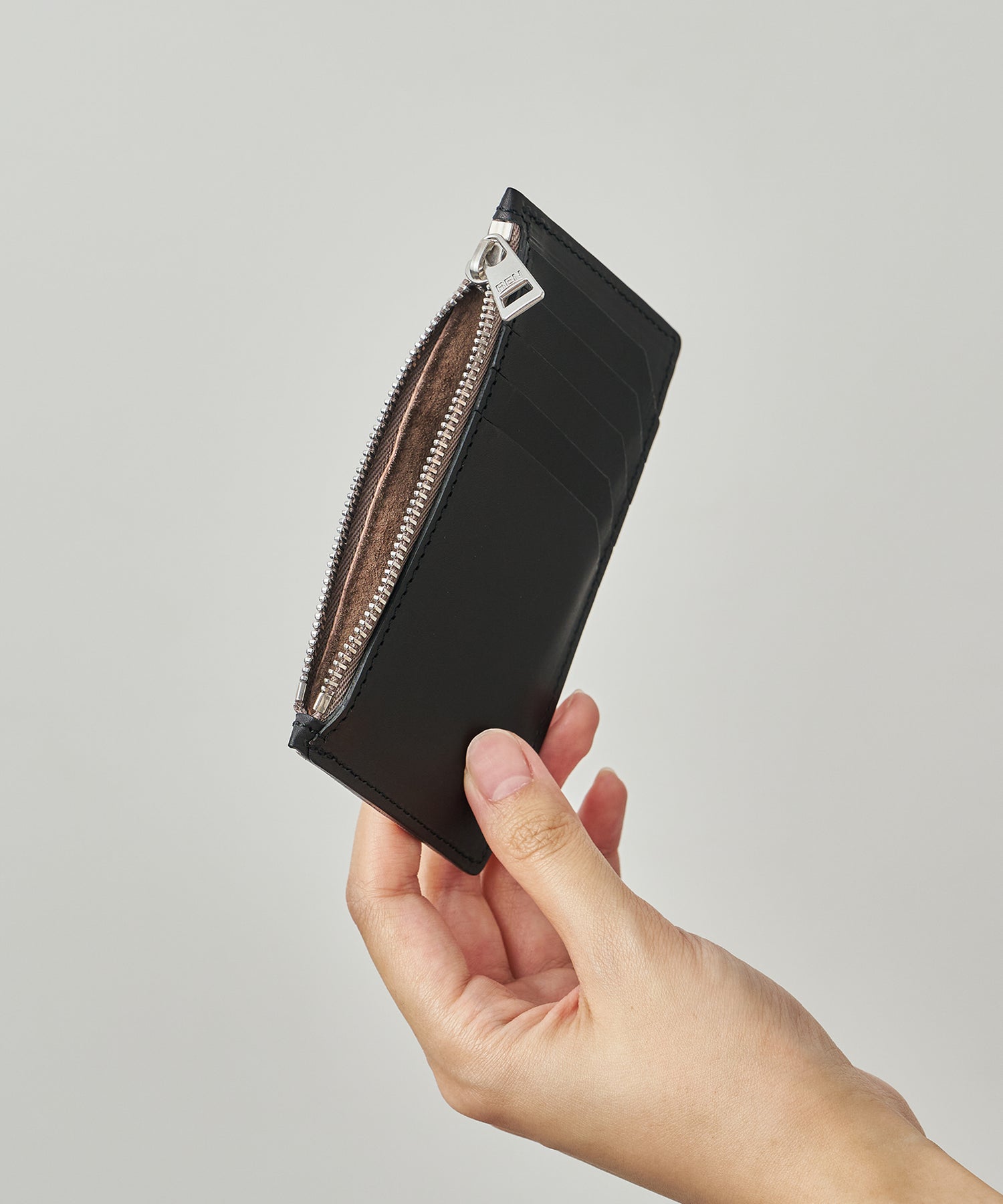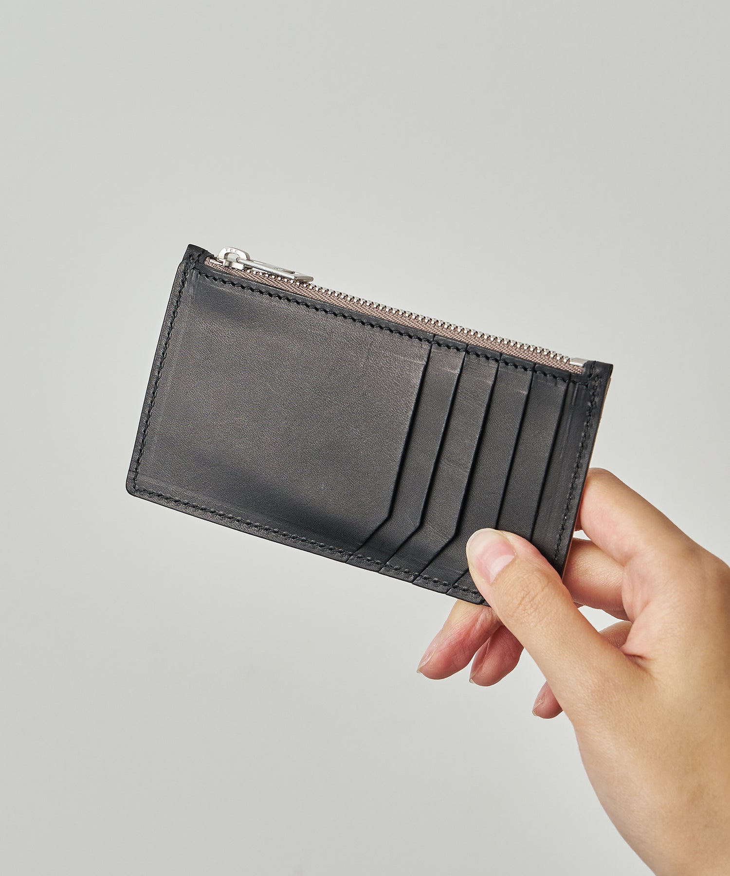 クロム鞣しを施し、銀面(表面)には端正なシボを型押ししたカウレザーです。薄くコーティングをかけ顔料仕上げにすることで、撥水性も持たせています。そのため、経年による変化もほとんど起こりません。変化を楽しむより、気兼ねなく毎日使えることを目指した素材です。いっぽう、強い力が加わり革が伸びると、表面の顔料が割れていくことがあります。大きなバッグに大量に荷物を入れる場合など、ハンドル部分はとくに注意が必要。内側の革は伸びるのに顔料は伸びないためですが、それはとりもなおさず、本物の革を加工している証でもあります。また顔料仕上げのメリットは、カラーリングの小回りが利くことにも。毎回まったく同じ顔料があるわけではなく、革の面積や使う量で微妙に色合いが変わることもしばしば。その繊細さも含めて、私たちは魅力と感じています。