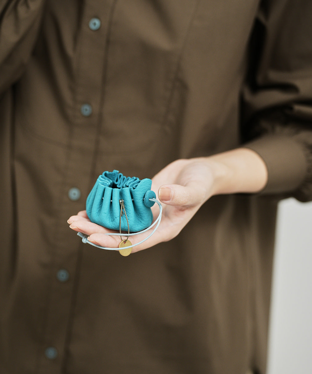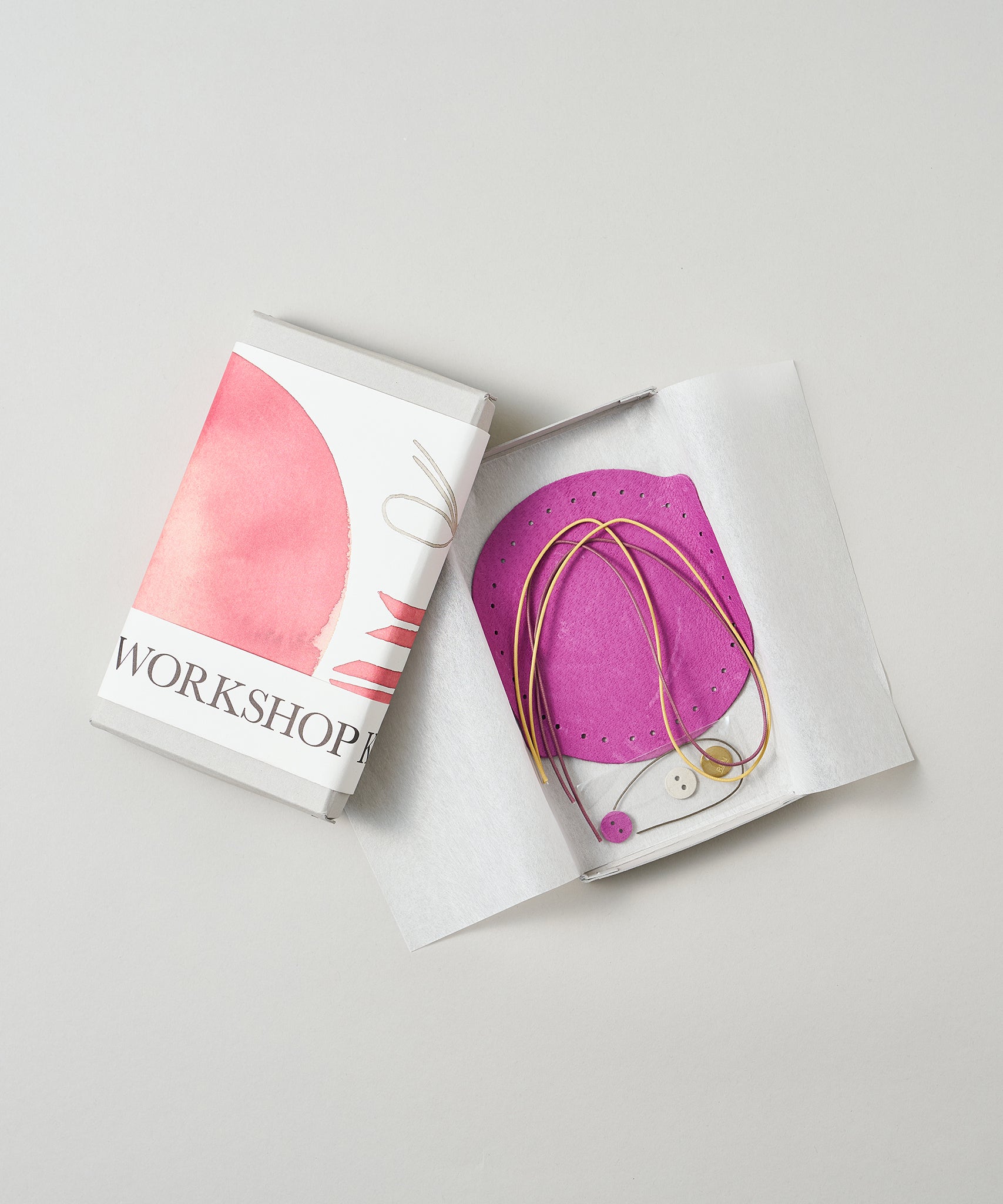 必要なものは、ハサミだけ。おうちで気軽にレザークラフトが楽しめる『ワークショップキット』。キットに入っている革パーツを組み立てると、小さなレザー巾着が完成します。