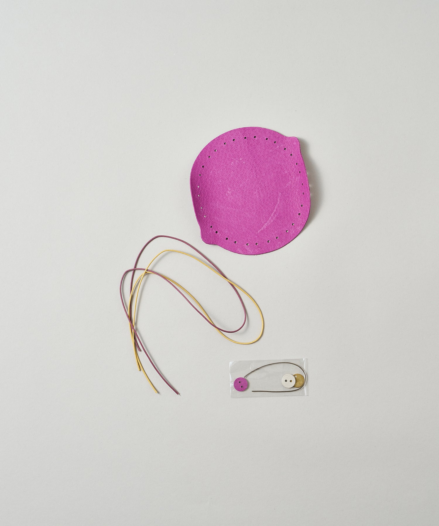 必要なものは、ハサミだけ。おうちで気軽にレザークラフトが楽しめる『ワークショップキット』。キットに入っている革パーツを組み立てると、小さなレザー巾着が完成します。